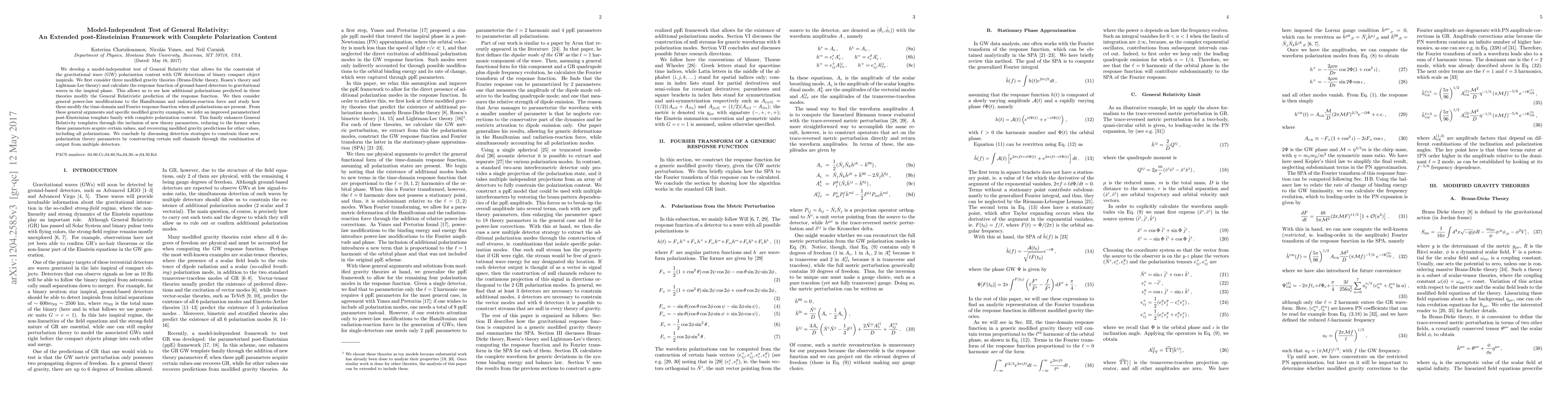 We develop a model-independent test of General Relativity that allows for the constraint of the gravitational wave (GW) polarization content with GW detections of binary compact object inspirals. We first consider three modified gravity theories (Brans-Dicke theory, Rosen's theory and Lightman-Lee theory) and calculate the response function of ground-based detectors to gravitational waves in the inspiral phase. This allows us to see how additional polarizations predicted in these theories modify the General Relativistic prediction of the response function. We then consider general power-law modifications to the Hamiltonian and radiation-reaction force and study how these modify the time-domain and Fourier response function when all polarizations are present. From these general arguments and specific modified gravity examples, we infer an improved parameterized post-Einsteinian template family with complete polarization content. This family enhances General Relativity templates through the inclusion of new theory parameters, reducing to the former when these parameters acquire certain values, and recovering modified gravity predictions for other values, including all polarizations. We conclude by discussing detection strategies to constrain these new, polarization theory parameters by constructing certain null channels through the combination of output from multiple detectors.