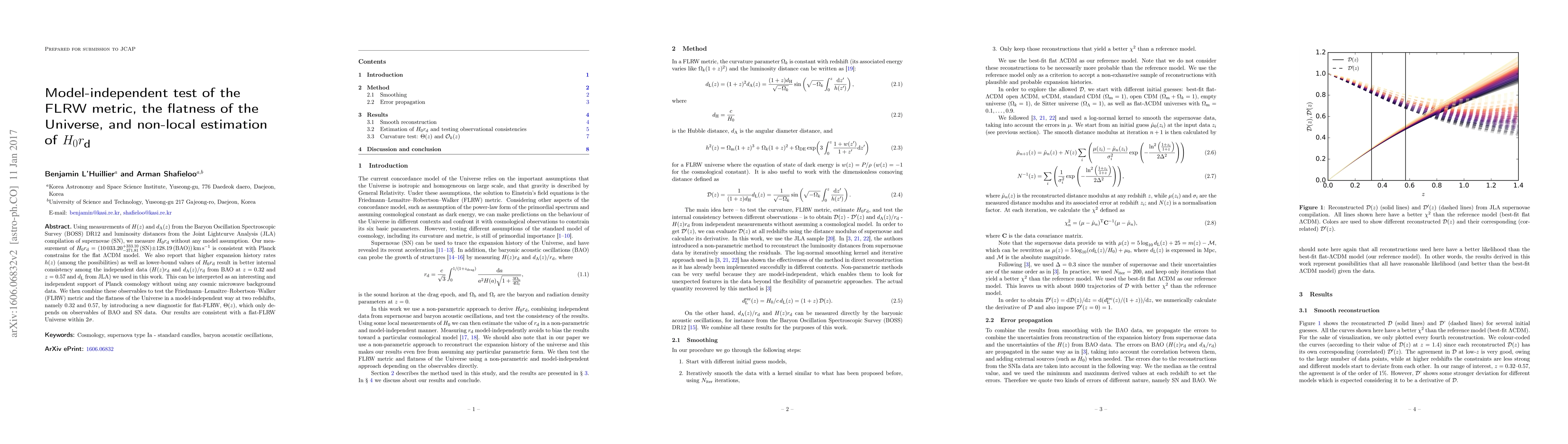 Using measurements of $H(z)$ and $d_\mathrm{A}(z)$ from the Baryon Oscillation Spectroscopic Survey (BOSS) DR12 and luminosity distances from the Joint Lightcurve Analysis (JLA) compilation of supernovae (SN), we measure $H_0 r_\mathrm{d}$ without any model assumption. Our measurement of $H_0 r_\mathrm{d} = $($10033.20^{+333.10}_{-371.81}$ (SN) $\pm$ 128.19 (BAO)) km s$^{-1}$ is consistent with Planck constrains for the flat {\Lambda}CDM model. We also report that higher expansion history rates $h(z)$ (among the possibilities) as well as lower-bound values of $H_0 r\mathrm{d}$ result in better internal consistency among the independent data (H(z)rd and $d_\mathrm{A}(z)/r_\mathrm{d}$ from BAO at $z=0.32$ and z=0.57 and $d_\mathrm{L}$ from JLA) we used in this work. This can be interpreted as an interesting and independent support of Planck cosmology without using any cosmic microwave background data. We then combine these observables to test the Friedmann-Lema\^itre-Robertson-Walker (FLRW) metric and the flatness of the Universe in a model-independent way at two redshifts, namely 0.32 and 0.57, by introducing a new diagnostic for flat-FLRW, $\Theta(z)$, which only depends on observables of BAO and SN data. Our results are consistent with a flat-FLRW Universe within $2{\sigma}$.