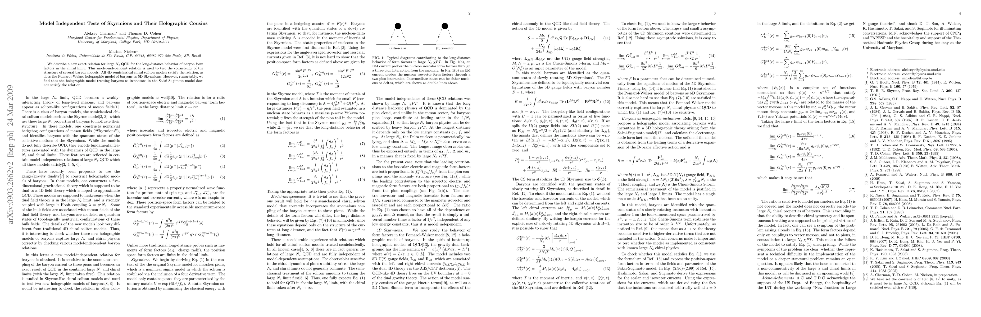 We describe a new exact relation for large $N_c$ QCD for the long-distance behavior of baryon form factors in the chiral limit. This model-independent relation is used to test the consistency of the structure of several baryon models. All 4D semiclassical chiral soliton models satisfy the relation, as does the Pomarol-Wulzer holographic model of baryons as 5D Skyrmions. However, remarkably, we find that the holographic model treating baryons as instantons in the Sakai-Sugimoto model does not satisfy the relation.