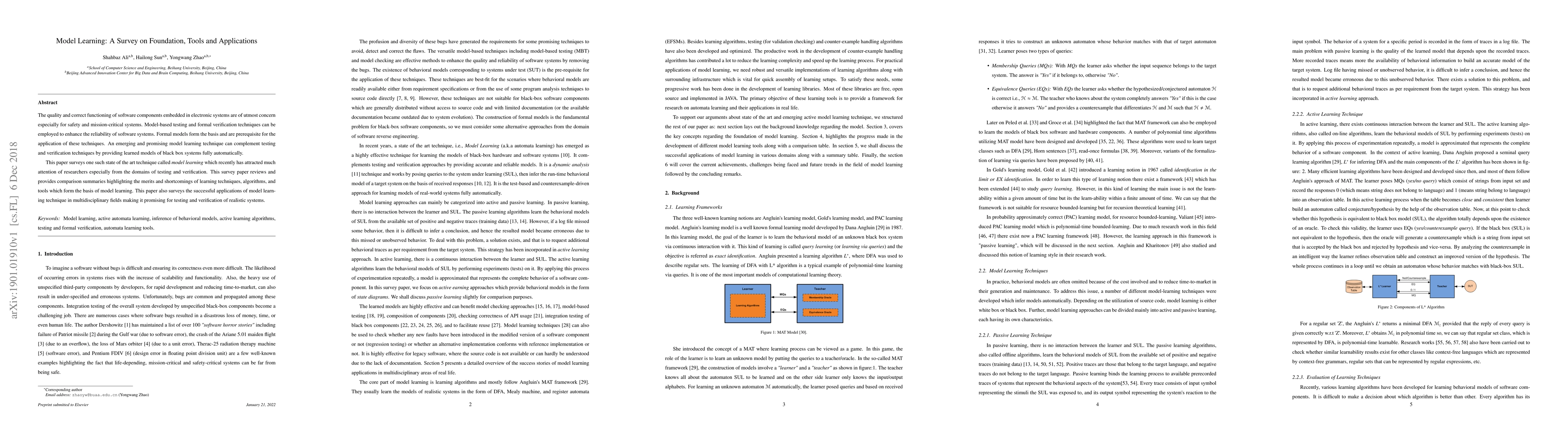 The quality and correct functioning of software components embedded in electronic systems are of utmost concern especially for safety and mission-critical systems. Model-based testing and formal verification techniques can be employed to enhance the reliability of software systems. Formal models form the basis and are prerequisite for the application of these techniques. An emerging and promising model learning technique can complement testing and verification techniques by providing learned models of black box systems fully automatically. This paper surveys one such state of the art technique called model learning which recently has attracted much attention of researchers especially from the domains of testing and verification. This survey paper reviews and provides comparison summaries highlighting the merits and shortcomings of learning techniques, algorithms, and tools which form the basis of model learning. This paper also surveys the successful applications of model learning technique in multidisciplinary fields making it promising for testing and verification of realistic systems.