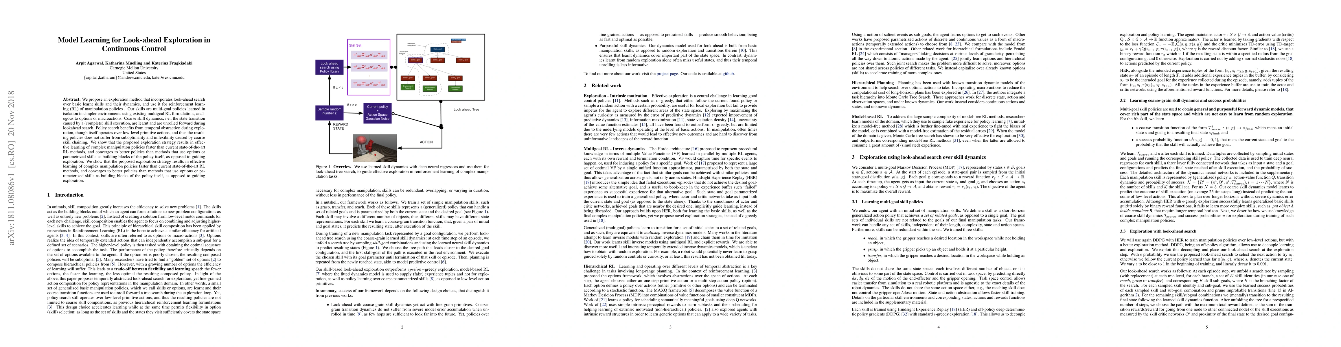 This paper proposes an exploration method that uses look-ahead search over learned skills and their dynamics to enhance reinforcement learning for manipulation tasks. The method results in faster learning and better policies compared to existing state-of-the-art RL techniques.
