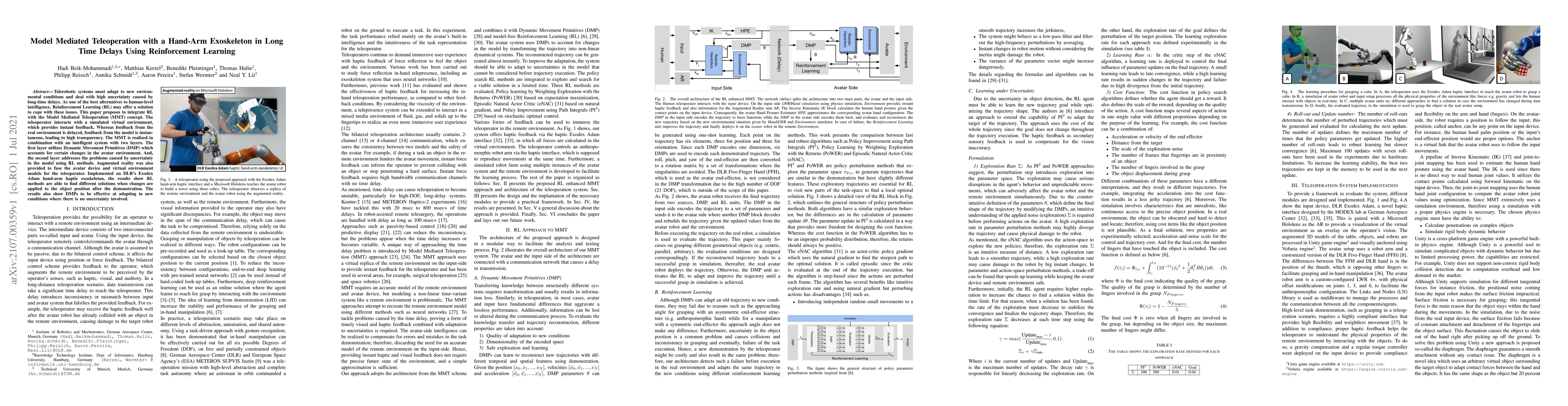 Telerobotic systems must adapt to new environmental conditions and deal with high uncertainty caused by long-time delays. As one of the best alternatives to human-level intelligence, Reinforcement Learning (RL) may offer a solution to cope with these issues. This paper proposes to integrate RL with the Model Mediated Teleoperation (MMT) concept. The teleoperator interacts with a simulated virtual environment, which provides instant feedback. Whereas feedback from the real environment is delayed, feedback from the model is instantaneous, leading to high transparency. The MMT is realized in combination with an intelligent system with two layers. The first layer utilizes Dynamic Movement Primitives (DMP) which accounts for certain changes in the avatar environment. And, the second layer addresses the problems caused by uncertainty in the model using RL methods. Augmented reality was also provided to fuse the avatar device and virtual environment models for the teleoperator. Implemented on DLR's Exodex Adam hand-arm haptic exoskeleton, the results show RL methods are able to find different solutions when changes are applied to the object position after the demonstration. The results also show DMPs to be effective at adapting to new conditions where there is no uncertainty involved.