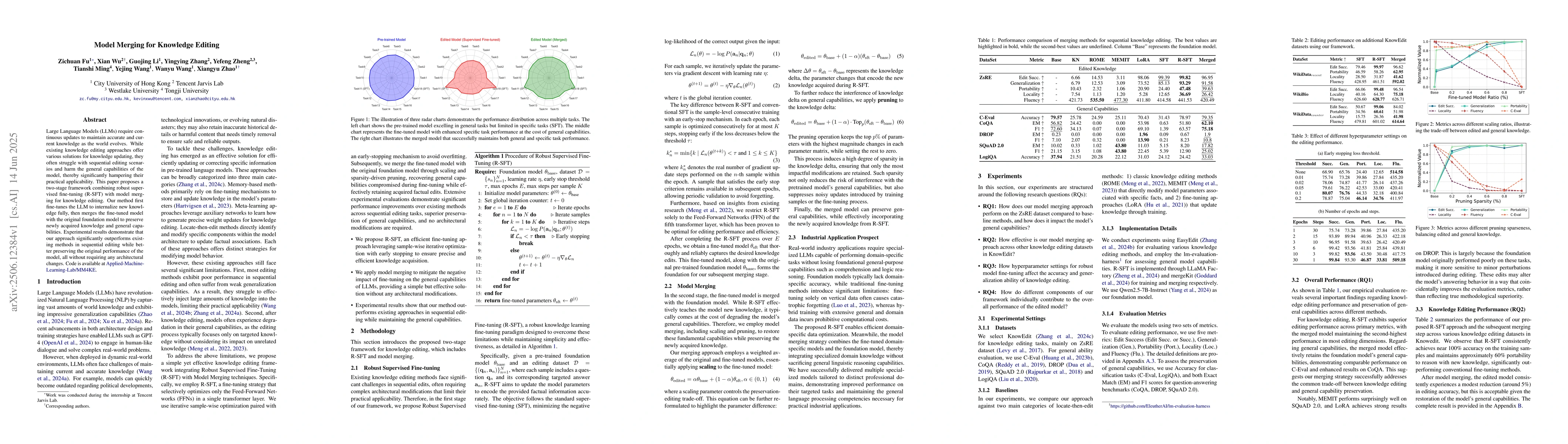 Large Language Models (LLMs) require continuous updates to maintain accurate and current knowledge as the world evolves. While existing knowledge editing approaches offer various solutions for knowledge updating, they often struggle with sequential editing scenarios and harm the general capabilities of the model, thereby significantly hampering their practical applicability. This paper proposes a two-stage framework combining robust supervised fine-tuning (R-SFT) with model merging for knowledge editing. Our method first fine-tunes the LLM to internalize new knowledge fully, then merges the fine-tuned model with the original foundation model to preserve newly acquired knowledge and general capabilities. Experimental results demonstrate that our approach significantly outperforms existing methods in sequential editing while better preserving the original performance of the model, all without requiring any architectural changes. Code is available at: https://github.com/Applied-Machine-Learning-Lab/MM4KE.