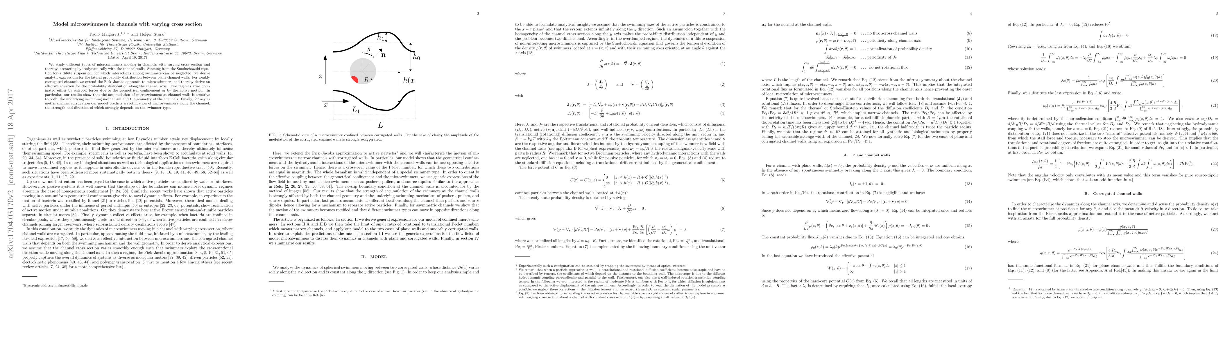 Researchers studied how microswimmers move in channels with varying cross-sections, finding that their motion is affected by both the channel's geometry and their own swimming mechanism, leading to accumulation at walls and even rectification along the channel.