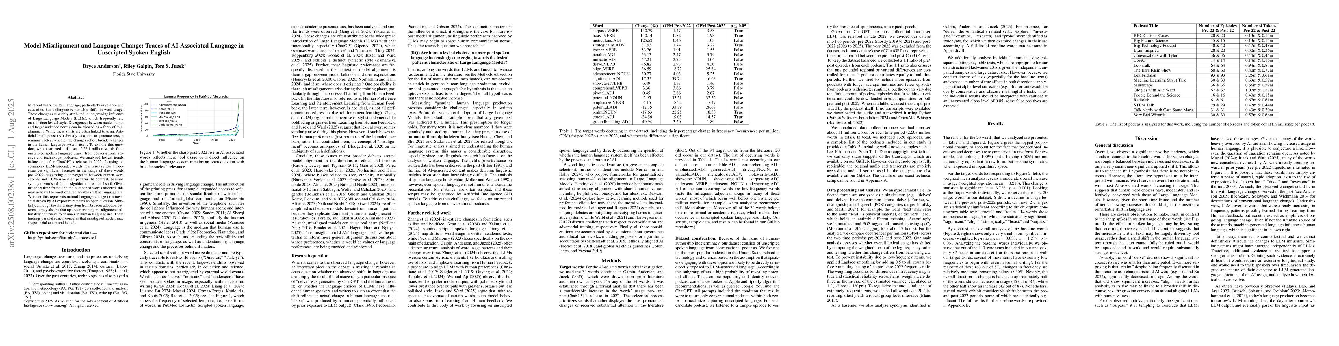 In recent years, written language, particularly in science and education, has undergone remarkable shifts in word usage. These changes are widely attributed to the growing influence of Large Language Models (LLMs), which frequently rely on a distinct lexical style. Divergences between model output and target audience norms can be viewed as a form of misalignment. While these shifts are often linked to using Artificial Intelligence (AI) directly as a tool to generate text, it remains unclear whether the changes reflect broader changes in the human language system itself. To explore this question, we constructed a dataset of 22.1 million words from unscripted spoken language drawn from conversational science and technology podcasts. We analyzed lexical trends before and after ChatGPT's release in 2022, focusing on commonly LLM-associated words. Our results show a moderate yet significant increase in the usage of these words post-2022, suggesting a convergence between human word choices and LLM-associated patterns. In contrast, baseline synonym words exhibit no significant directional shift. Given the short time frame and the number of words affected, this may indicate the onset of a remarkable shift in language use. Whether this represents natural language change or a novel shift driven by AI exposure remains an open question. Similarly, although the shifts may stem from broader adoption patterns, it may also be that upstream training misalignments ultimately contribute to changes in human language use. These findings parallel ethical concerns that misaligned models may shape social and moral beliefs.