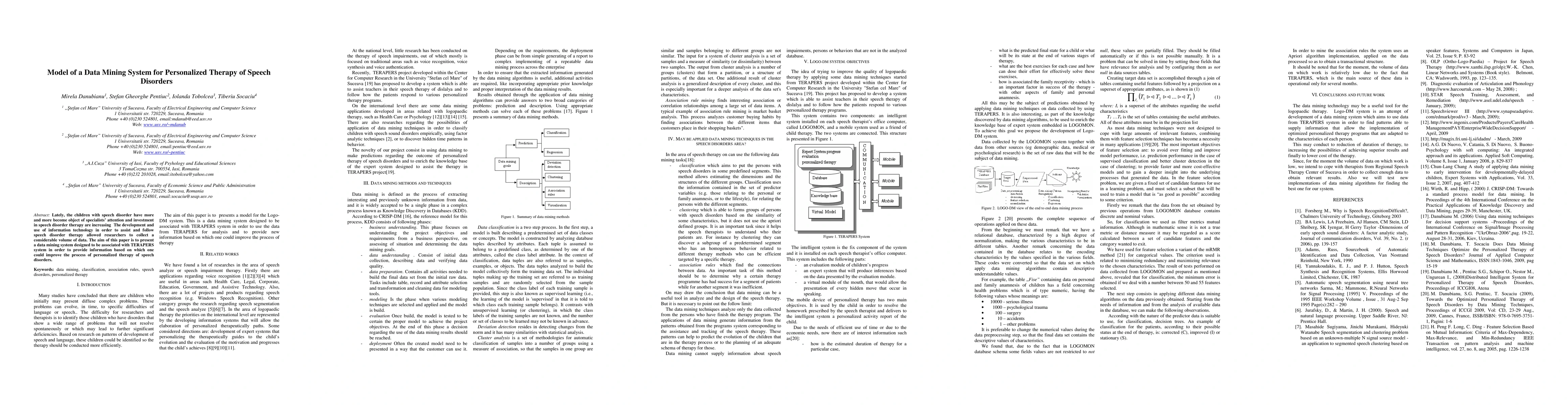 Lately, the children with speech disorder have more and more become object of specialists attention and investment in speech disorder therapy are increasing The development and use of information technology in order to assist and follow speech disorder therapy allowed researchers to collect a considerable volume of data. The aim of this paper is to present a data mining system designed to be associated with TERAPERS system in order to provide information based on which one could improve the process of personalized therapy of speech disorders.