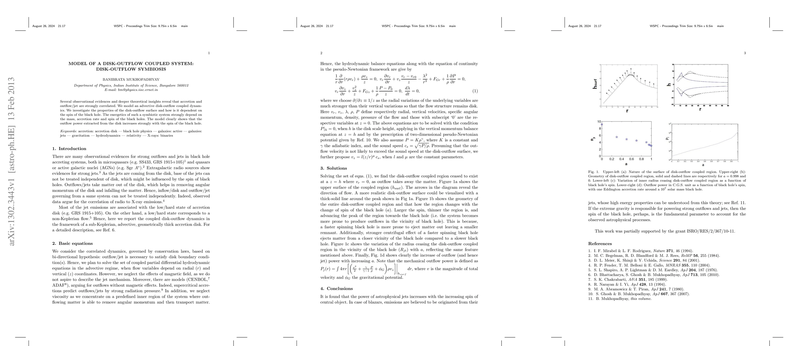 The research uses a coupled disk-outflow dynamics model, solving a set of coupled partial differential hydrodynamic equations in the advective regime.