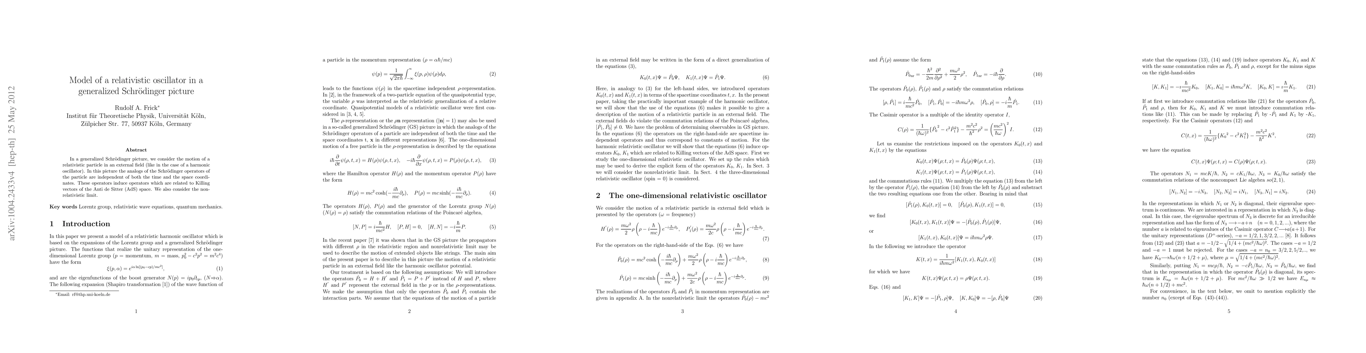 In a generalized Schr\"odinger picture, we consider the motion of a relativistic particle in an external field (like in the case of a harmonic oscillator). In this picture the analogs of the Schr\"odinger operators of the particle are independent of both the time and the space coordinates. These operators induce operators which are related to Killing vectors of the Anti de Sitter (AdS) space. We also consider the nonrelativistic limit.