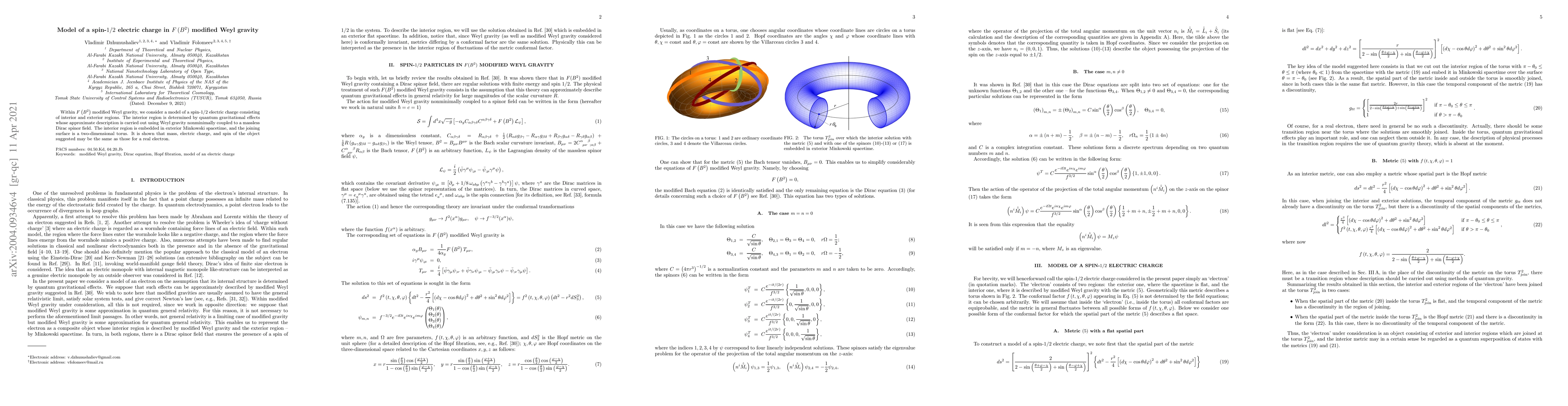 Within $F\left( B^2\right)$ modified Weyl gravity, we consider a model of a spin-$1/2$ electric charge consisting of interior and exterior regions. The interior region is determined by quantum gravitational effects whose approximate description is carried out using Weyl gravity nonminimally coupled to a massless Dirac spinor field. The interior region is embedded in exterior Minkowski spacetime, and the joining surface is a two-dimensional torus. It is shown that mass, electric charge, and spin of the object suggested may be the same as those for a real electron.