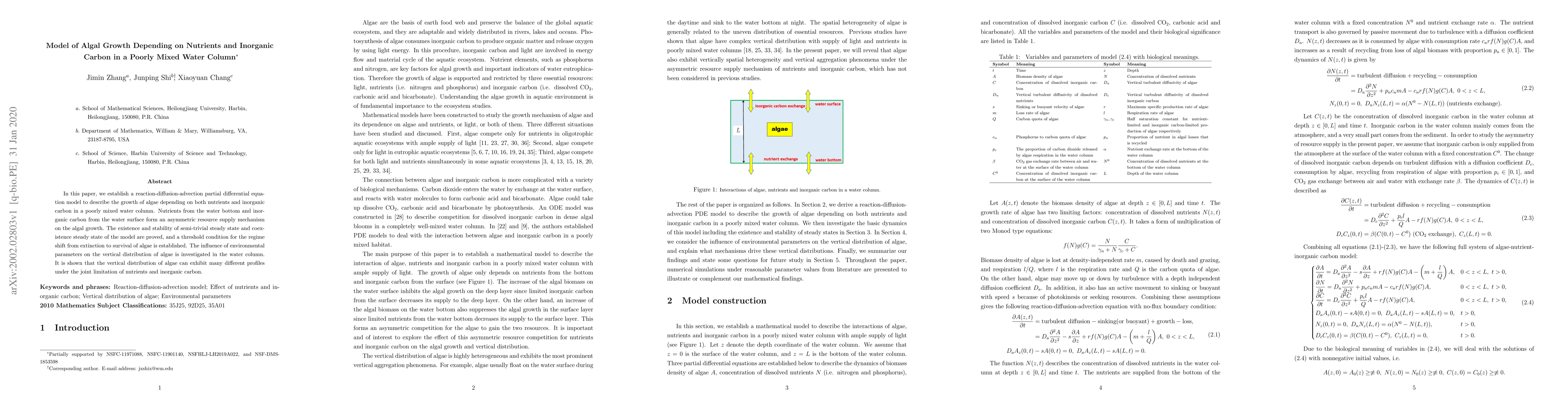 A model describes how algal growth depends on nutrients and inorganic carbon in a poorly mixed water column, establishing threshold conditions for algae survival and vertical distribution patterns.