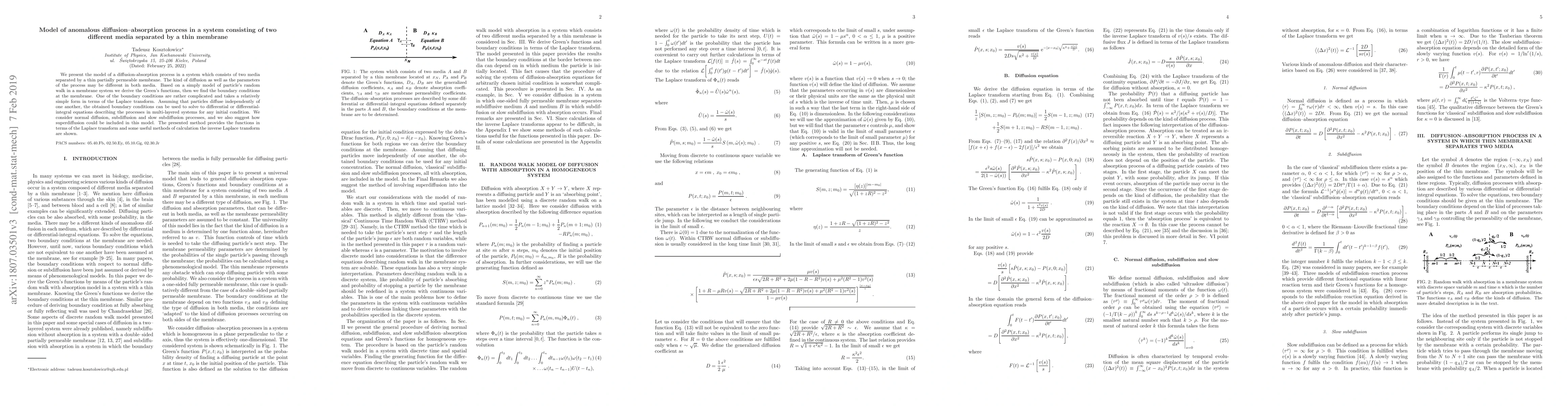 This paper models diffusion-absorption processes in a system with two distinct media separated by a thin membrane, deriving Green's functions and boundary conditions, including complex conditions expressed via Laplace transforms. The model accommodates normal, subdiffusion, and slow subdiffusion, with potential for superdiffusion inclusion.