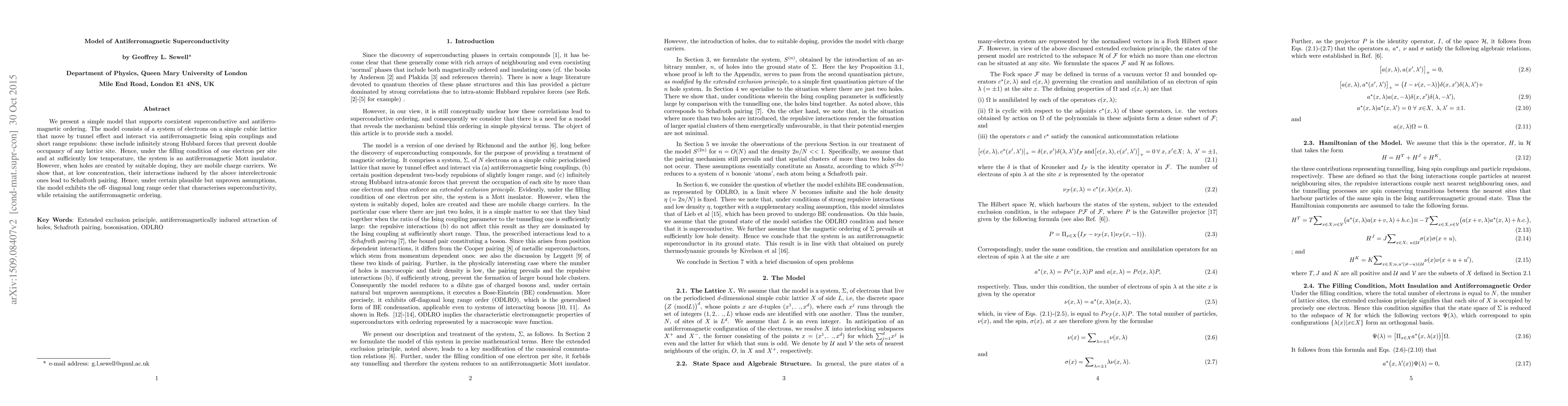 We present a simple model that supports superconductive and antiferromagnetic ordering. The model consists of a system of electrons on a simple cubic lattice that move by tunnel effect and interact via antiferromagnetic Ising spin couplings and short range repulsions: these include infinitely strong Hubbard forces that prevent double occupancy of any lattice site. Hence, under the filling condition of one electron per site and at sufficiently low temperature, the system is an antiferromagnetic Mott insulator. However, when holes are created by suitable doping, they are mobile charge carriers. We show that, at low concentration, their interactions induced by the above interelectronic ones lead to Schafroth pairing. Hence, under certain plausible but unproved assumptions, the model exhibits the off-diagonal long range order that characterises superconductivity, while retaining the antiferromagnetic ordering.