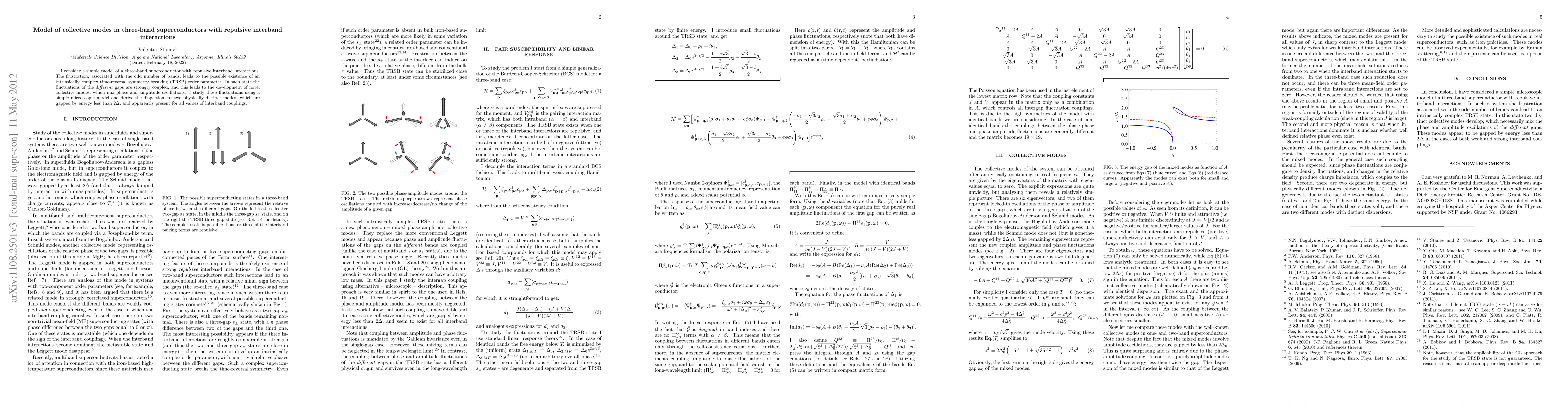 This paper explores a three-band superconductor model with repulsive interband interactions, revealing the emergence of complex time-reversal symmetry breaking order parameters and novel collective modes that mix phase and amplitude oscillations. The study derives the dispersion for two distinct, gapped collective modes present across various interband coupling values.