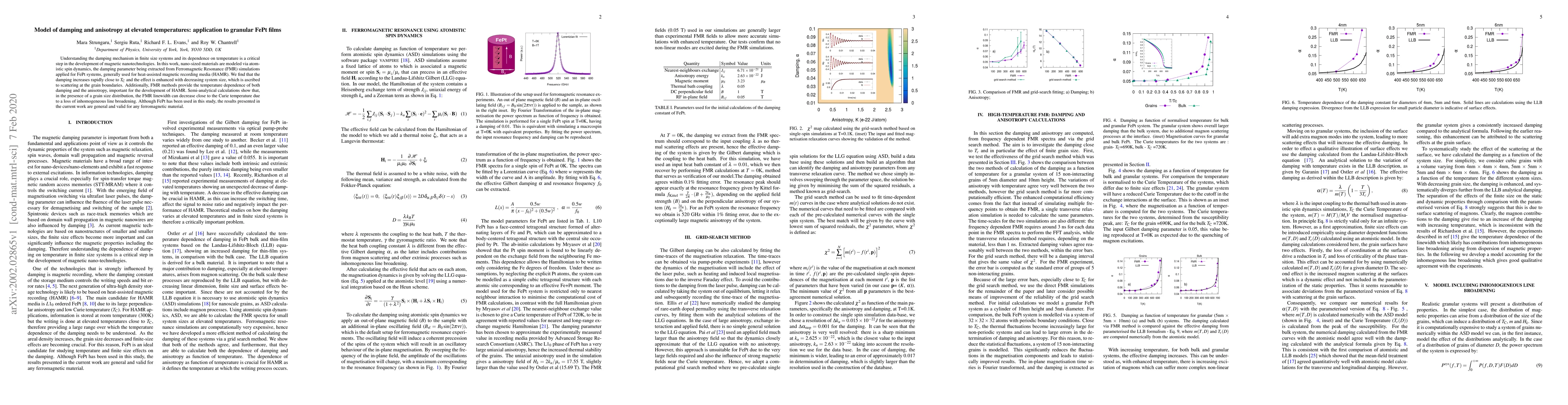 This paper models damping and anisotropy in granular FePt films using atomistic spin dynamics and FMR simulations, revealing that damping increases near the Curie temperature, especially in smaller systems due to grain boundary scattering. The findings are applicable to the development of heat-assisted magnetic recording technologies.