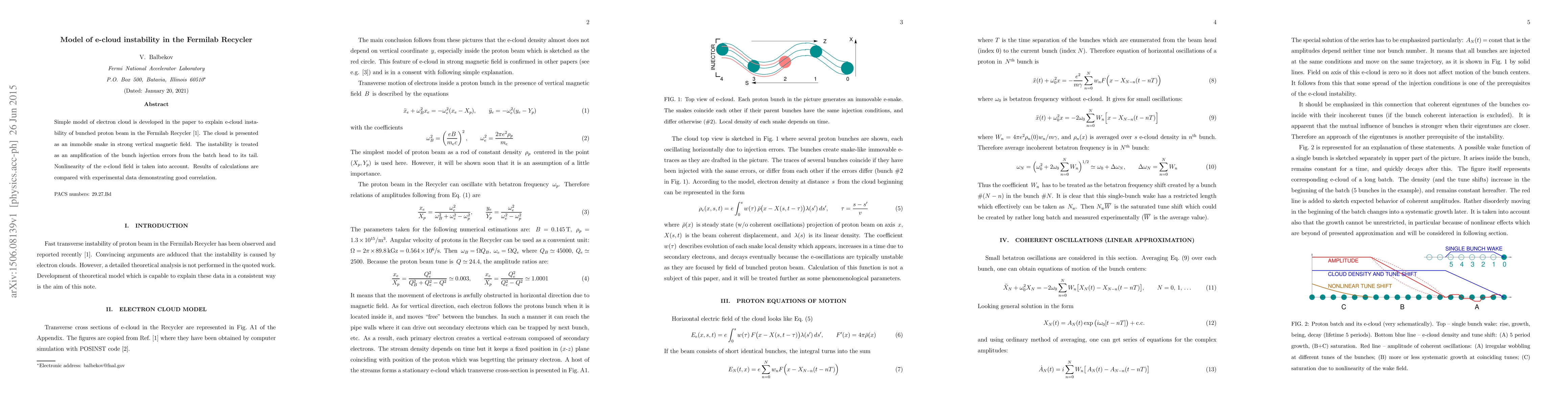 Simple model of electron cloud is developed in the paper to explain e-cloud instability of bunched proton beam in the Fermilab Recycler. The cloud is presented as an immobile snake in strong vertical magnetic field. The instability is treated as an amplification of the bunch injection errors from the batch head to its tail. Nonlinearity of the e-cloud field is taken into account. Results of calculations are compared with experimental data demonstrating good correlation.