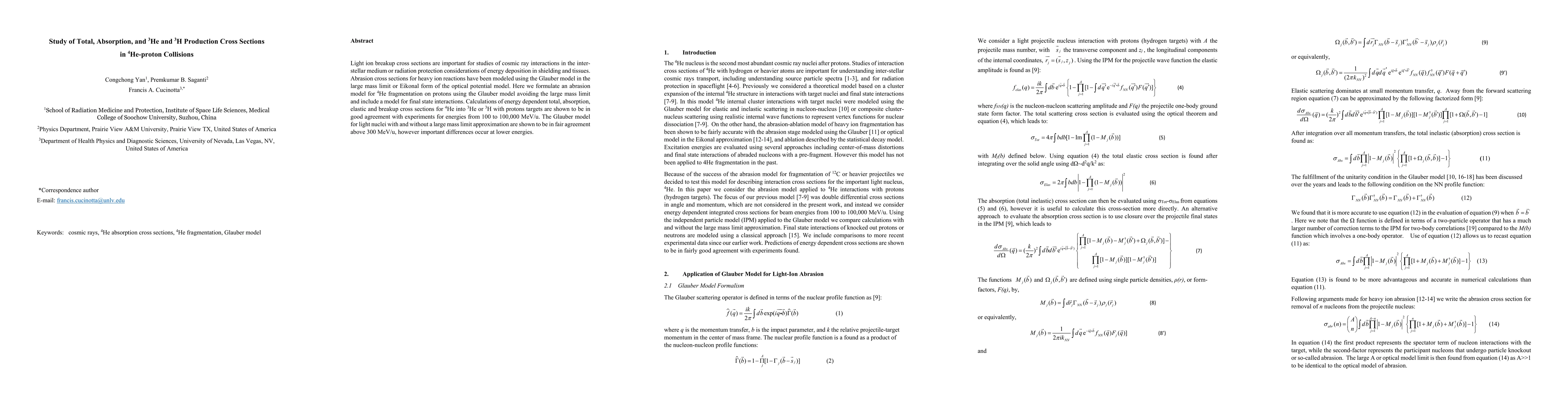 Light ion (A<5) breakup cross sections are important for studies of cosmic ray interactions in the inter-stellar medium or radiation protection considerations of energy deposition in tissue. Nucleon abrasion cross sections for heavy ion reactions are often calculated using the Glauber model in the large mass limit or with the Eikonal form of the optical potential model. Here we formulate an abrasion model for 4He nuclei fragmentation on hydrogen targets with a classical model for final state interactions. Comparisons to the heavy ion abrasion model are made. Calculations of energy dependent total, absorption, elastic and breakup cross sections for 4He into 3He or 3H with protons targets are shown to be in good agreement with experimental measurements for energies from 100 to 100,000 MeV/u. The Glauber model for light nuclei and the large mass limit to the model are shown to be in close agreement for 4He-proton interactions above 300 MeV/u, however important differences occur at lower energies.