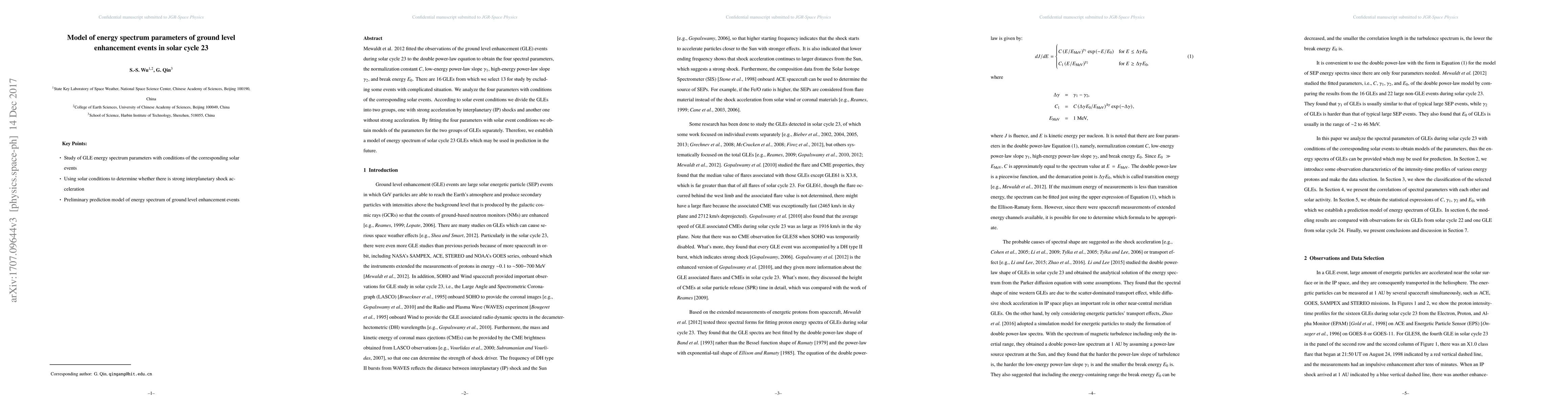Mewaldt et al. (2012) developed a model for the energy spectrum parameters of 13 ground level enhancement (GLE) events during solar cycle 23, categorizing them based on the presence of strong interplanetary shock acceleration. The study provides separate models for these parameters based on solar event conditions, potentially useful for future predictions.