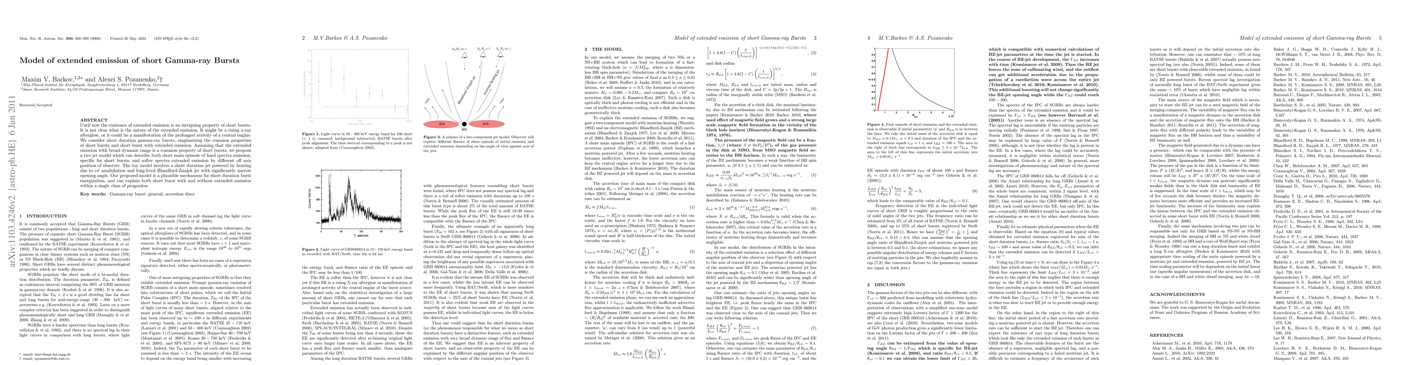 Until now the existence of extended emission is an intriguing property of short bursts. It is not clear what is the nature of the extended emission. It might be a rising x-ray afterglow, or it could be a manifestation of the prolonged activity of a central engine. We consider short duration gamma-ray bursts, emphasizing the common properties of short bursts and short burst with extended emission. Assuming that the extended emission with broad dynamic range is a common property of short bursts, we propose a two jet model which can describe both short main episode of hard spectra emission, specific for short bursts, and softer spectra extended emission by different off axis position of observer. The toy model involves a short duration jet powered by heating due to $\nu\tilde{\nu}$ annihilation and long-lived Blandford-Znajek jet with significantly narrow opening angle. Our proposed model is a plausible mechanism for short duration burst energization, and can explain both short burst with and without extended emission within a single class of progenitor.
