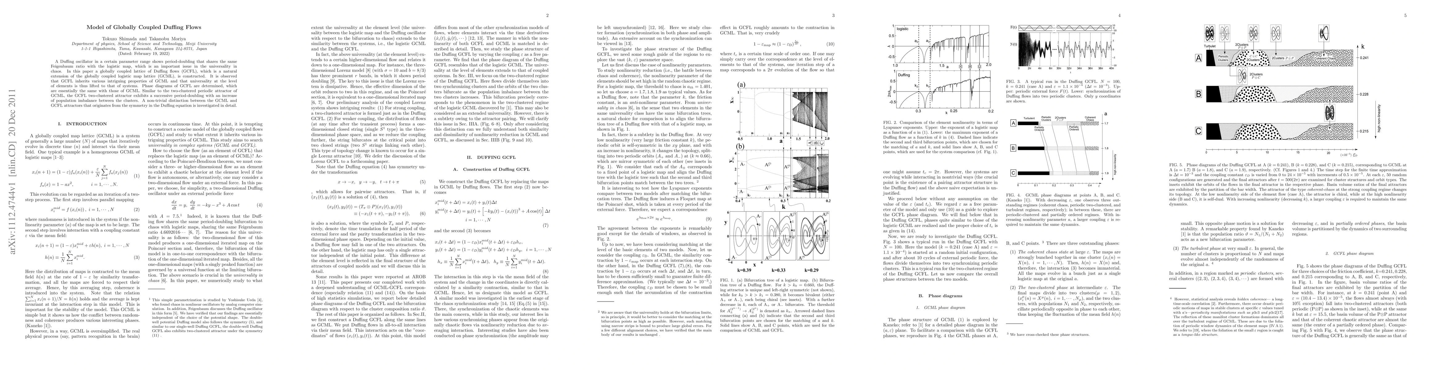 This paper constructs a globally coupled lattice of Duffing flows (GCFL), extending the globally coupled logistic map lattice (GCML). It finds GCFL retains GCML's properties, including universality in chaos, and determines similar phase diagrams. GCFL's two-clustered attractor exhibits period-doubling, with unique distinctions due to Duffing equation symmetry.