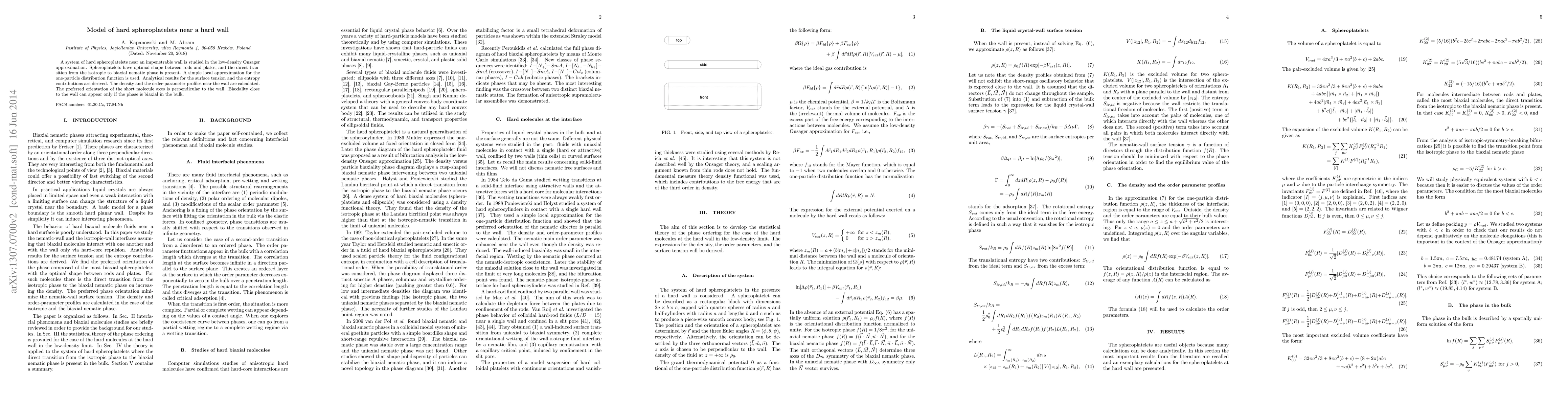 This paper investigates the behavior of hard spheroplatelets near a hard wall using the Onsager approximation, revealing a direct transition from isotropic to biaxial nematic phase. Analytical results show that the preferred orientation of spheroplatelets is perpendicular to the wall, and biaxiality near the wall depends on the bulk phase.