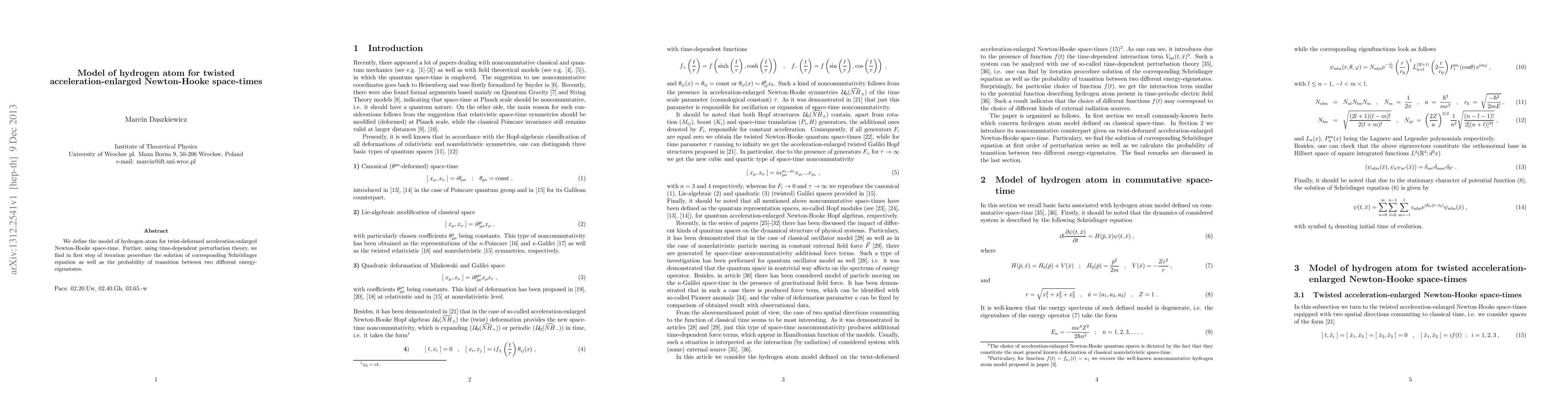 This paper proposes a model of the hydrogen atom within a twist-deformed, acceleration-enlarged Newton-Hooke space-time framework. It employs time-dependent perturbation theory to derive the Schrödinger equation solution and calculate transition probabilities between energy eigenstates.
