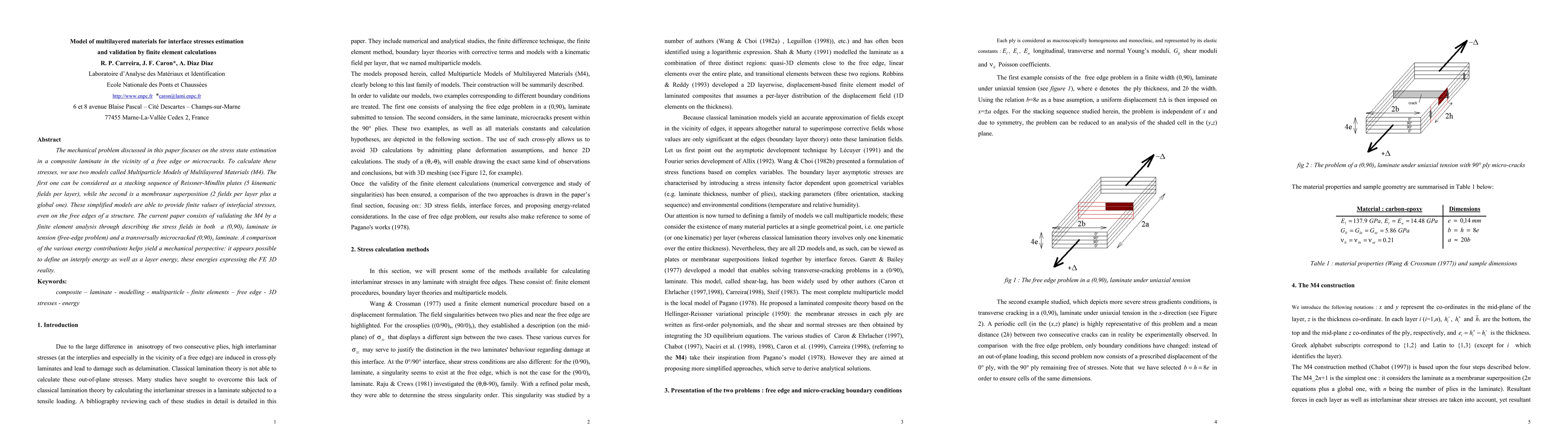 The mechanical problem discussed in this paper focuses on the stress state estimation in a composite laminate in the vicinity of a free edge or microcracks. To calculate these stresses, we use two models called Multiparticle Models of Multilayered Materials (M4). The first one can be considered as a stacking sequence of Reissner-Mindlin plates (5 kinematic fields per layer), while the second is a membranar superposition (2 fields per layer plus a global one). These simplified models are able to provide finite values of interfacial stresses, even on the free edges of a structure. The current paper consists of validating the M4 by a finite element analysis through describing the stress fields in both a (0,90)s laminate in tension (free-edge problem) and a transversally microcracked (0,90)s laminate. A comparison of the various energy contributions helps yield a mechanical perspective: it appears possible to define an interply energy as well as a layer energy, these energies expressing the FE 3D reality.