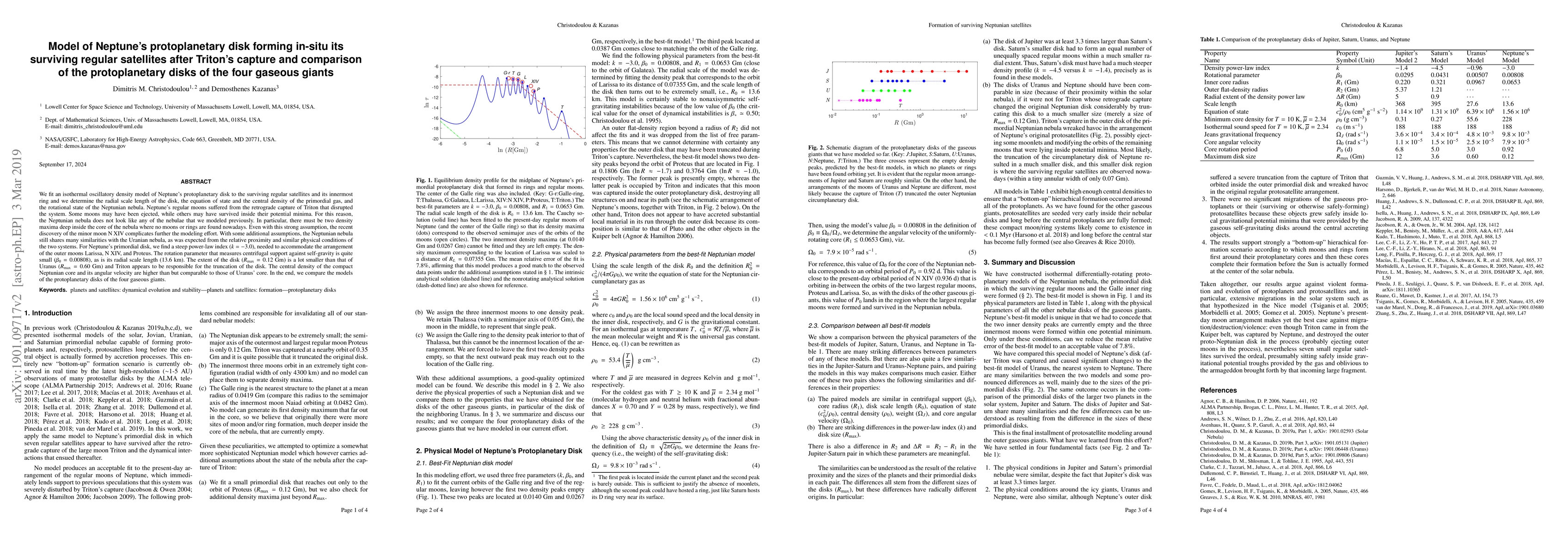 This paper models Neptune's protoplanetary disk using an isothermal oscillatory density model, finding a small radial scale length and a steep power-law index, and compares it to the disks of the other gaseous giants, noting similarities with Uranus despite Triton's disruptive influence on Neptune's satellites.