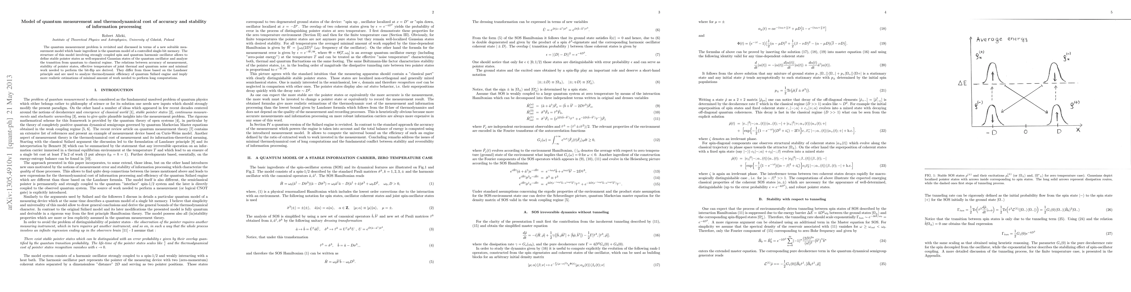 The quantum measurement problem is revisited and discussed in terms of a new solvable measurement model which basic ingredient is the quantum model of a controlled single-bit memory. The structure of this model involving strongly coupled spin and quantum harmonic oscillator allows to define stable pointer states as well-separated Gaussian states of the quantum oscillator and analyze the transition from quantum to classical regime. The relations between accuracy of measurement, stability of pointer states, effective temperature of joint thermal and quantum noise and minimal work needed to perform the bit-flip are derived. They differ from those based on the Landauer principle and are used to analyze thermodynamic efficiency of quantum Szilard engine and imply more realistic estimations of minimal amount of work needed to perform long computations.