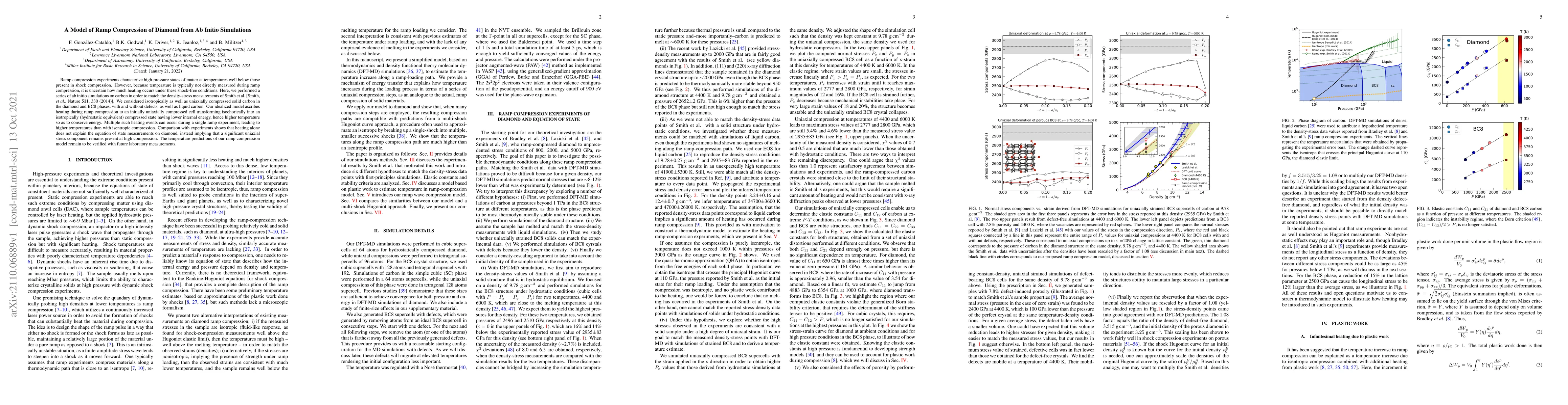 This paper uses ab initio simulations to model the ramp compression of diamond, showing that heating during ramp compression can lead to higher temperatures than isentropic compression due to energy conservation. The results suggest that significant uniaxial stress components persist at high compression, and future laboratory measurements are needed to verify the temperature predictions.