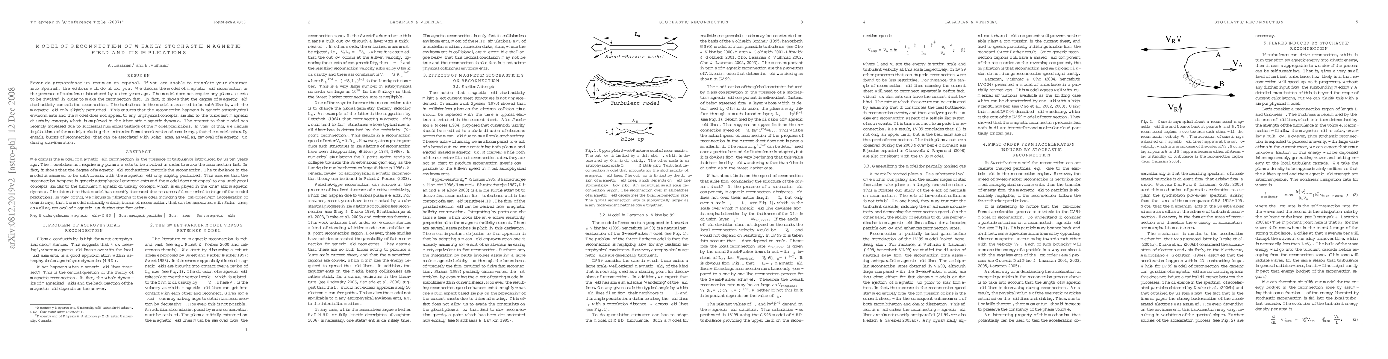 This paper presents a model for magnetic field reconnection in weakly stochastic environments, emphasizing turbulence without plasma effects. The model's implications include first-order Fermi acceleration of cosmic rays, bursts of reconnection linked to solar flares, and the removal of magnetic flux during star-formation.