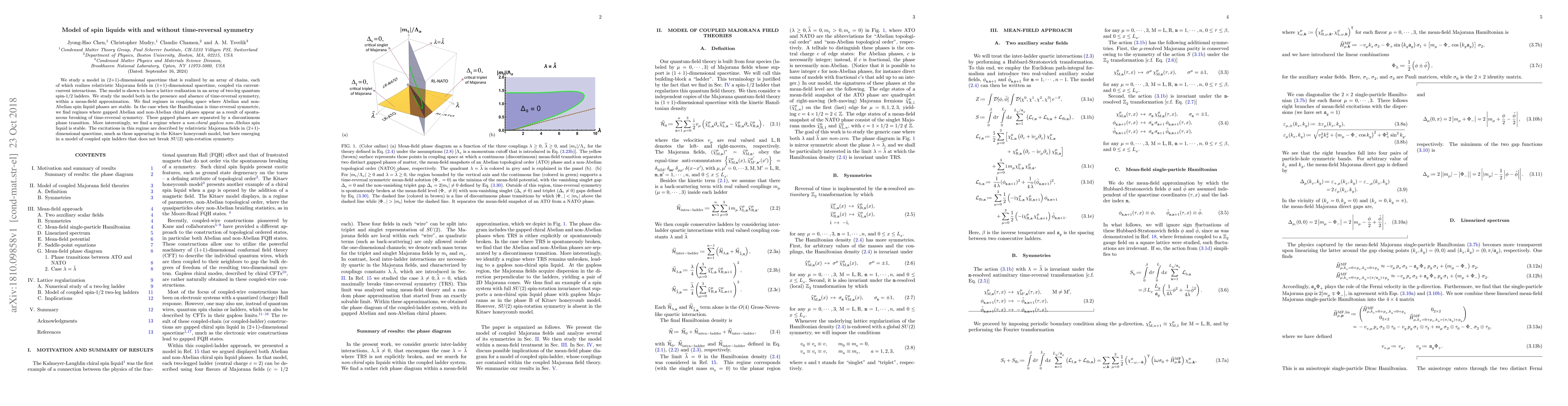 We study a model in (2+1)-dimensional spacetime that is realized by an array of chains, each of which realizes relativistic Majorana fields in (1+1)-dimensional spacetime, coupled via current-current interactions. The model is shown to have a lattice realization in an array of two-leg quantum spin-1/2 ladders. We study the model both in the presence and absence of time-reversal symmetry, within a mean-field approximation. We find regimes in coupling space where Abelian and non-Abelian spin liquid phases are stable. In the case when the Hamiltonian is time-reversal symmetric, we find regimes where gapped Abelian and non-Abelian chiral phases appear as a result of spontaneous breaking of time-reversal symmetry. These gapped phases are separated by a discontinuous phase transition. More interestingly, we find a regime where a non-chiral gapless non-Abelian spin liquid is stable. The excitations in this regime are described by relativistic Majorana fields in (2+1)-dimensional spacetime, much as those appearing in the Kitaev honeycomb model, but here emerging in a model of coupled spin ladders that does not break SU(2) spin-rotation symmetry.