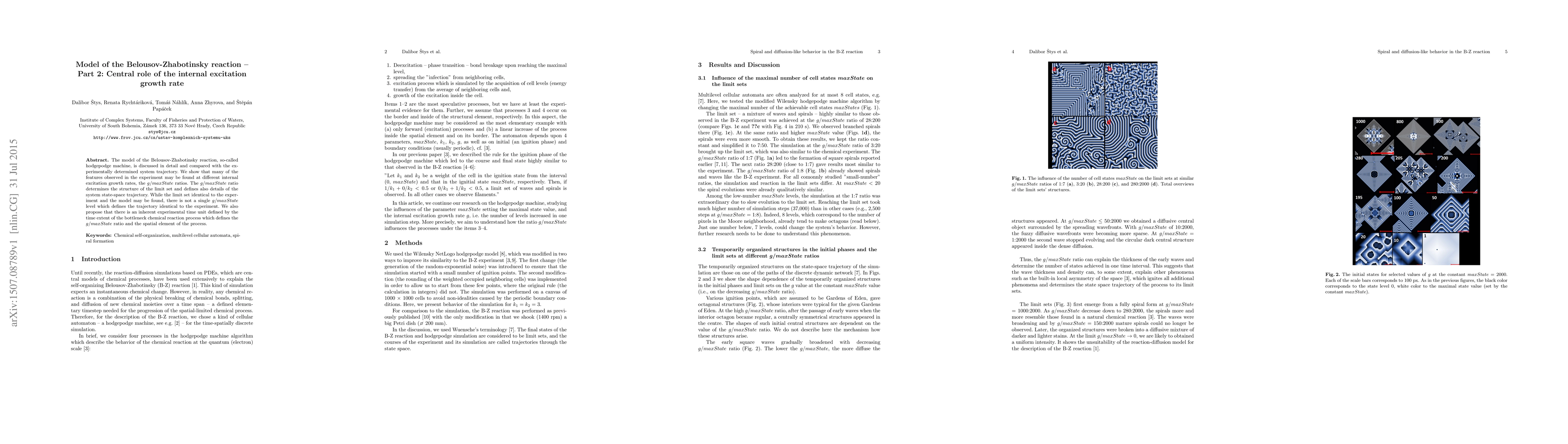 The model of the Belousov-Zhabotinsky reaction, so-called hodgepodge machine, is discussed in detail and compared with the experimentally determined system trajectory. We show that many of the features observed in the experiment may be found at different internal excitation growth rates, the g/maxState ratios. The g/maxState ratio determines the structure of the limit set and defines also details of the system state-space trajectory. While the limit set identical to the experiment and the model may be found, there is not a single g/maxState level which defines the trajectory identical to the experiment. We also propose that there is an inherent experimental time unit defined by the time extent of the bottleneck chemical reaction process which defines the g/maxState ratio and the spatial element of the process.