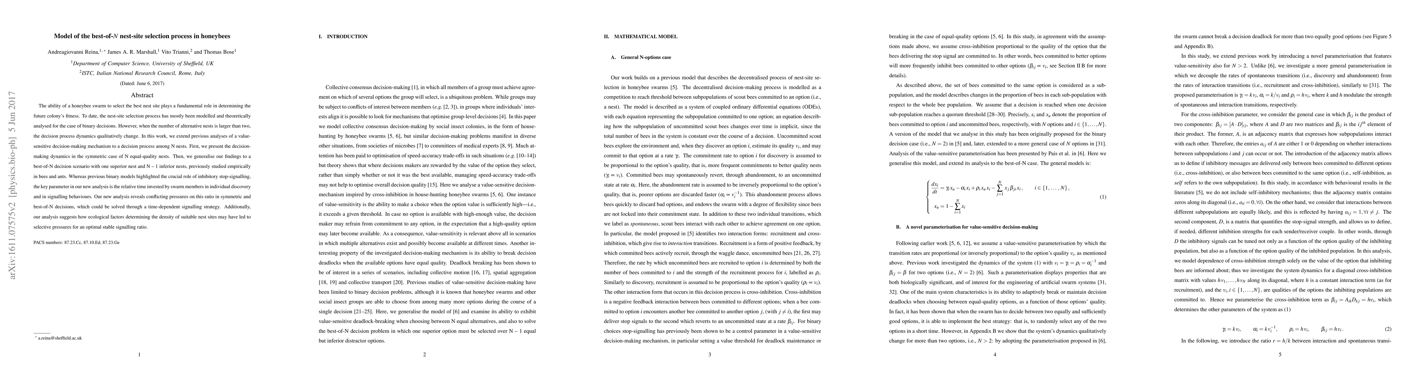 This paper extends the theoretical model of honeybee nest-site selection from binary decisions to scenarios involving multiple nests, analyzing the dynamics of best-of-N decision-making. It identifies the relative time invested in discovery and signalling as a key parameter, revealing conflicting pressures in symmetric and best-of-N scenarios that may be resolved through a time-dependent signalling strategy.