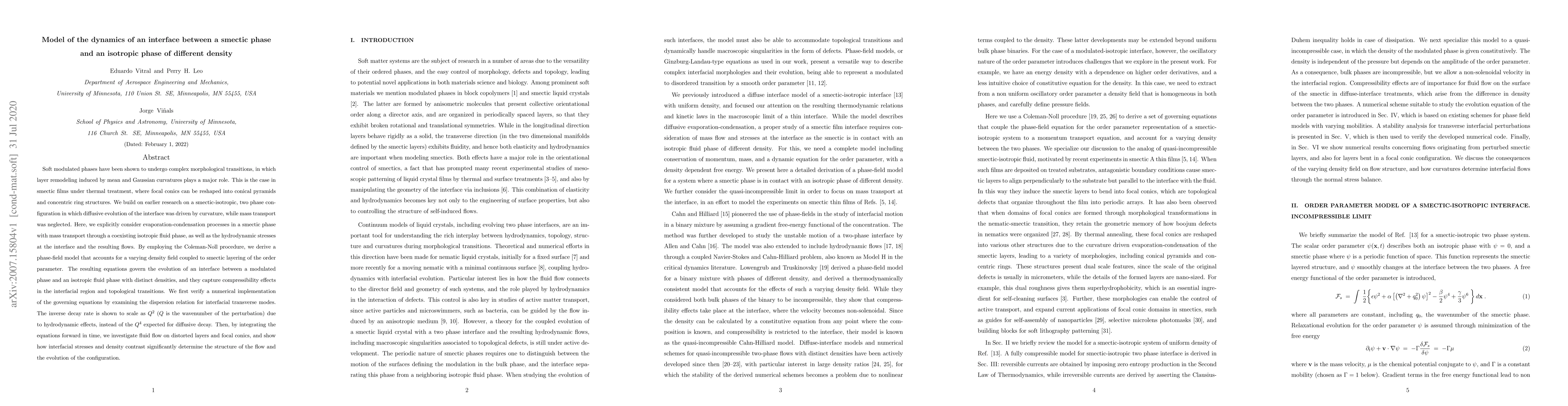 Researchers developed a model to study the dynamics of an interface between a smectic phase and an isotropic fluid phase with different densities, incorporating hydrodynamic stresses and evaporation-condensation processes.