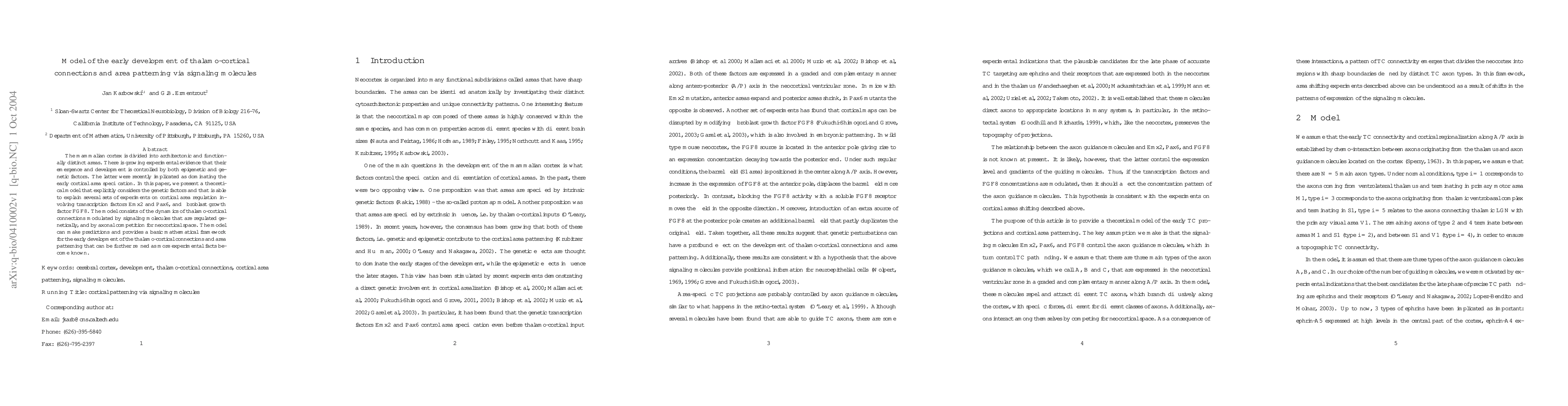 This paper presents a theoretical model explaining the early development of thalamo-cortical connections and cortical area patterning, focusing on genetic factors and signaling molecules like Emx2, Pax6, and FGF8. The model incorporates dynamics of thalamo-cortical connections and axonal competition, offering a mathematical framework for predicting and understanding these processes.