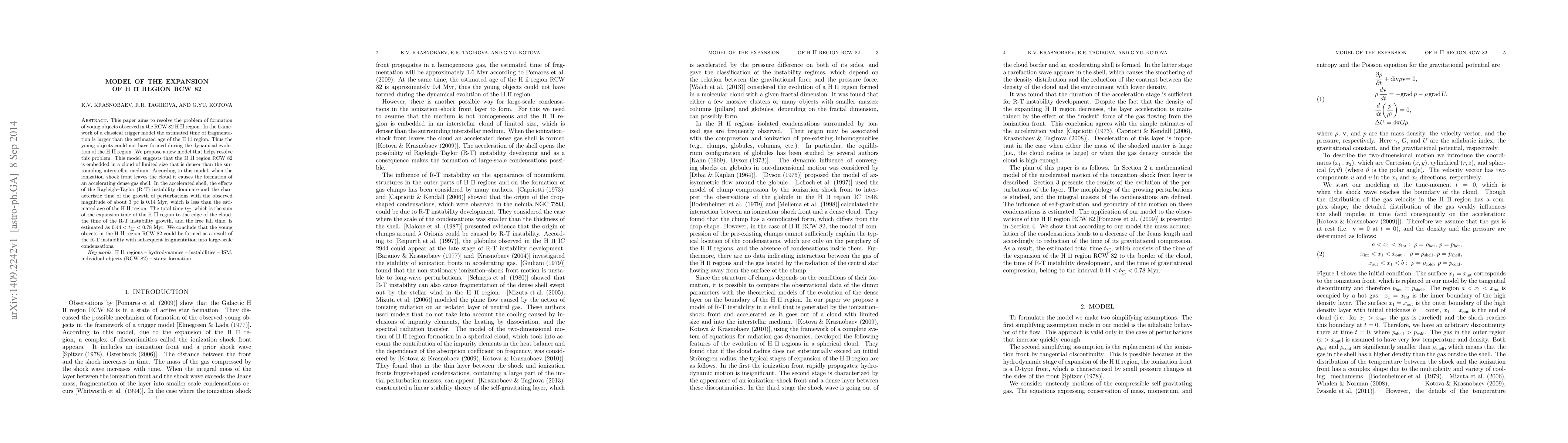 This paper proposes a new model to resolve the formation of young objects in the RCW 82 H II region, suggesting that the Rayleigh-Taylor instability in the accelerated dense gas shell formed by the ionization-shock front causes the fragmentation and formation of these objects within the estimated total time of 0.44 to 0.78 Myr.