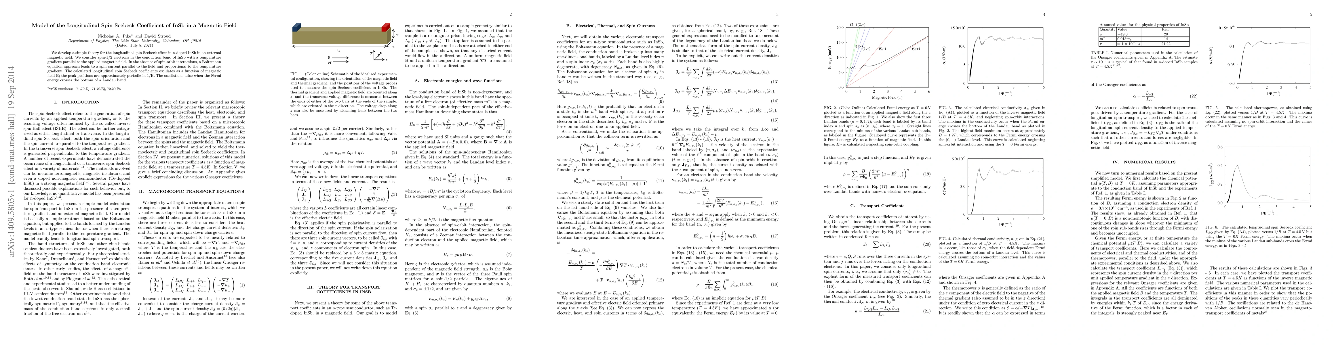 We develop a simple theory for the longitudinal spin Seebeck effect in n-doped InSb in an external magnetic field. We consider spin-$1/2$ electrons in the conduction band of InSb with a temperature gradient parallel to the applied magnetic field. In the absence of spin-orbit interactions, a Boltzmann equation approach leads to a spin current parallel to the field and proportional to the temperature gradient. The calculated longitudinal spin Seebeck coefficients oscillates as a function of magnetic field B; the peak positions are approximately periodic in 1/B. The oscillations arise when the Fermi energy crosses the bottom of a Landau band.