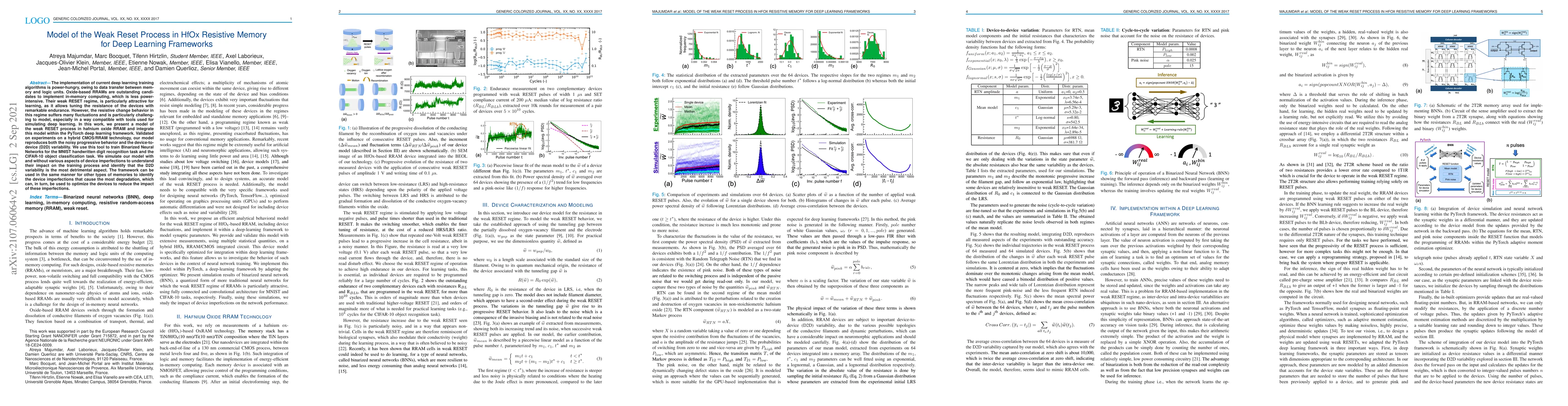 The implementation of current deep learning training algorithms is power-hungry, owing to data transfer between memory and logic units. Oxide-based RRAMs are outstanding candidates to implement in-memory computing, which is less power-intensive. Their weak RESET regime, is particularly attractive for learning, as it allows tuning the resistance of the devices with remarkable endurance. However, the resistive change behavior in this regime suffers many fluctuations and is particularly challenging to model, especially in a way compatible with tools used for simulating deep learning. In this work, we present a model of the weak RESET process in hafnium oxide RRAM and integrate this model within the PyTorch deep learning framework. Validated on experiments on a hybrid CMOS/RRAM technology, our model reproduces both the noisy progressive behavior and the device-to-device (D2D) variability. We use this tool to train Binarized Neural Networks for the MNIST handwritten digit recognition task and the CIFAR-10 object classification task. We simulate our model with and without various aspects of device imperfections to understand their impact on the training process and identify that the D2D variability is the most detrimental aspect. The framework can be used in the same manner for other types of memories to identify the device imperfections that cause the most degradation, which can, in turn, be used to optimize the devices to reduce the impact of these imperfections.