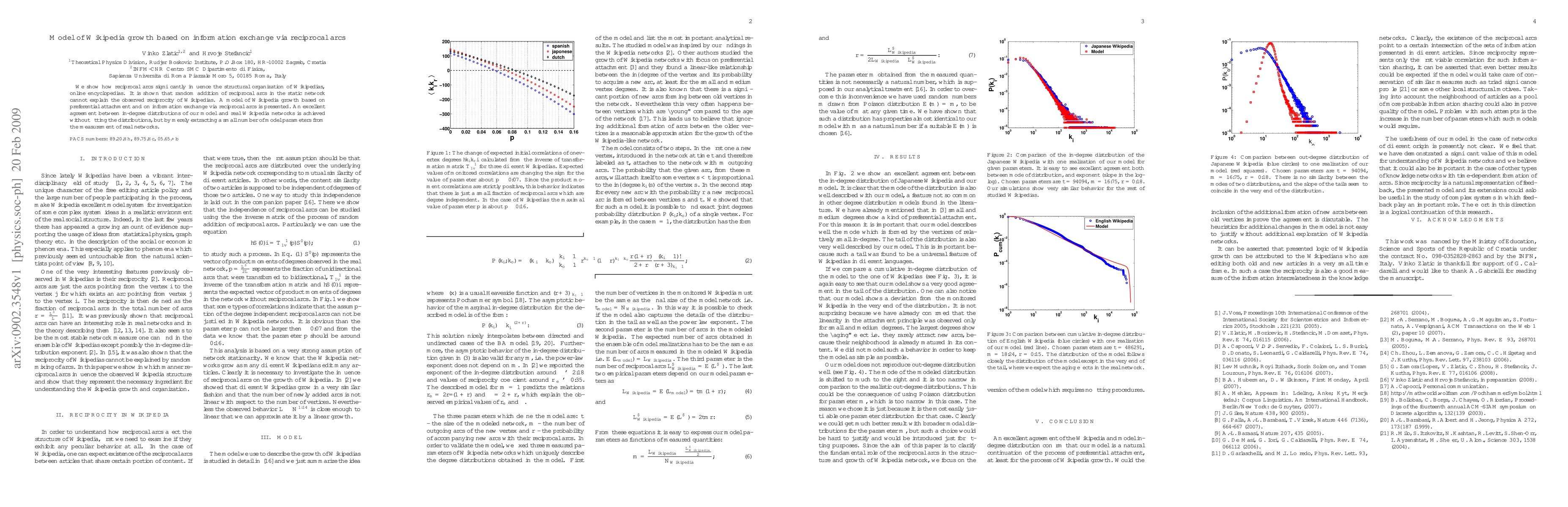 We show how reciprocal arcs significantly influence the structural organization of Wikipedias, online encyclopedias. It is shown that random addition of reciprocal arcs in the static network cannot explain the observed reciprocity of Wikipedias. A model of Wikipedia growth based on preferential attachment and on information exchange via reciprocal arcs is presented. An excellent agreement between in-degree distributions of our model and real Wikipedia networks is achieved without fitting the distributions, but by merely extracting a small number of model parameters from the measurement of real networks.