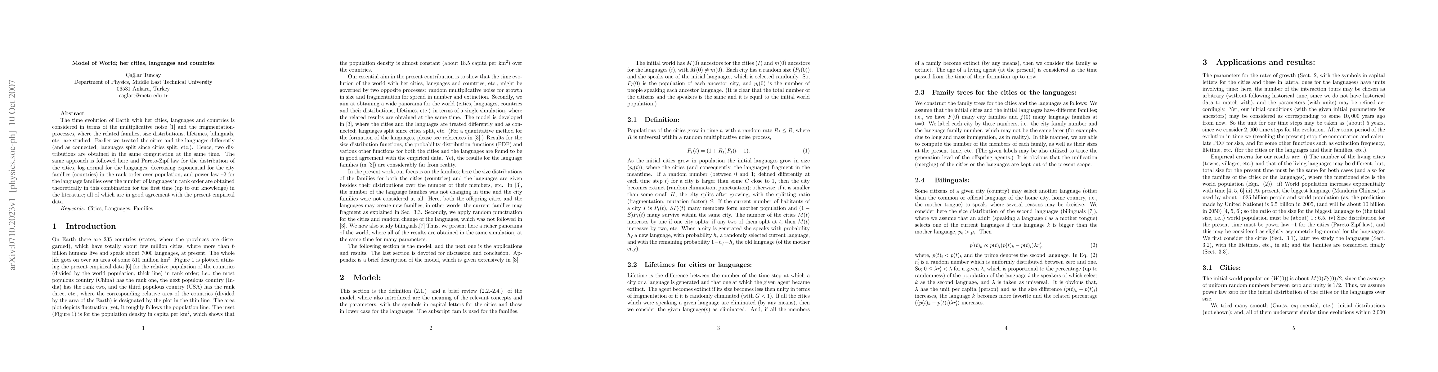 The time evolution of Earth with her cities, languages and countries is considered in terms of the multiplicative noise and the fragmentation- processes, where the related families, size distributions, lifetimes, bilinguals, etc. are studied. Earlier we treated the cities and the languages differently (and as connected; languages split since cities split, etc.). Hence, two dis- tributions are obtained in the same computation at the same time. The same approach is followed here and Pareto-Zipf law for the distribution of the cities, log-normal for the languages, decreasing exponential for the city families (countries) in the rank order over population, and power law -2 for the language families over the number of languages in rank order are obtained theoretically in this combination for the first time (up to our knowledge) in the literature; all of which are in good agreement with the present empirical data.