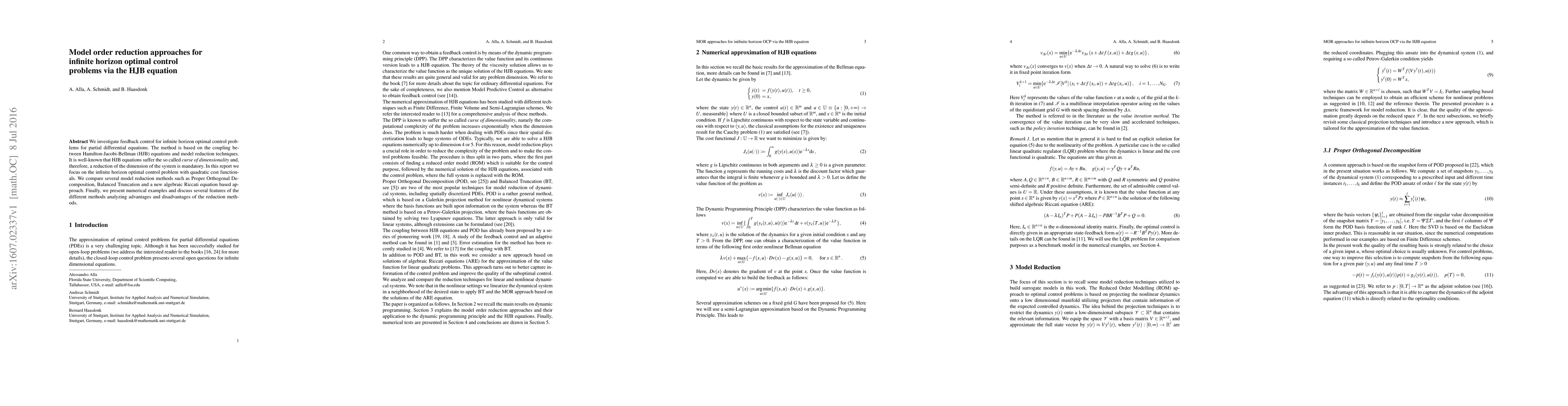 This paper explores model order reduction techniques for infinite horizon optimal control problems governed by partial differential equations, focusing on the coupling between Hamilton-Jacobi-Bellman (HJB) equations and various reduction methods. It compares Proper Orthogonal Decomposition, Balanced Truncation, and a novel algebraic Riccati equation-based approach, analyzing their advantages and disadvantages through numerical examples.