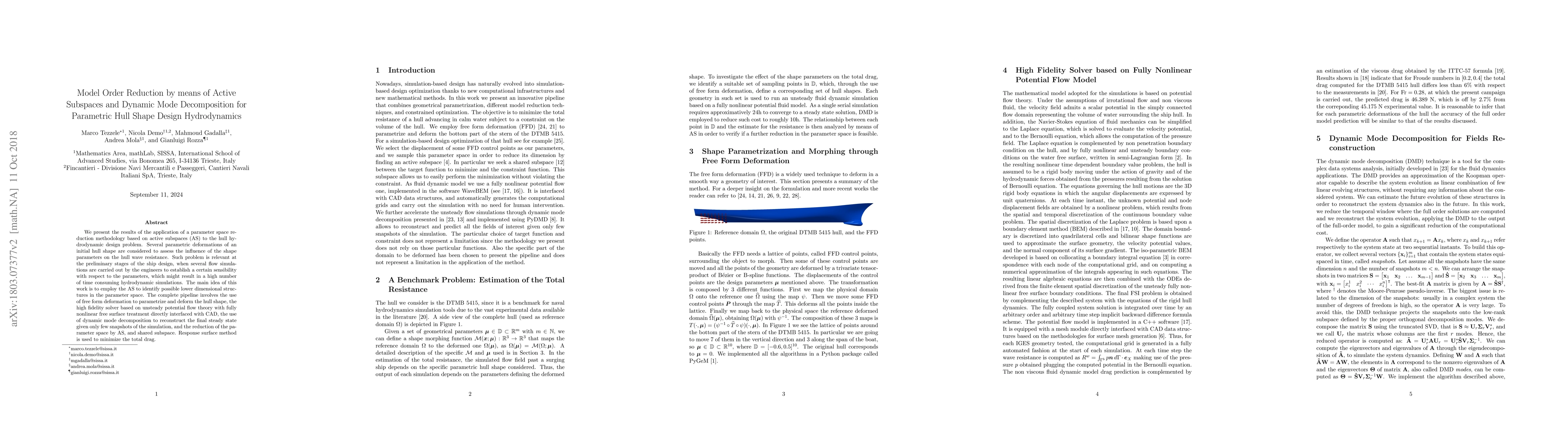 This paper applies active subspaces and dynamic mode decomposition to reduce the parameter space in hull hydrodynamic design, aiming to minimize the number of time-consuming flow simulations. The methodology combines free form deformation, high-fidelity solvers, and response surface methods to optimize hull shape parameters for wave resistance.