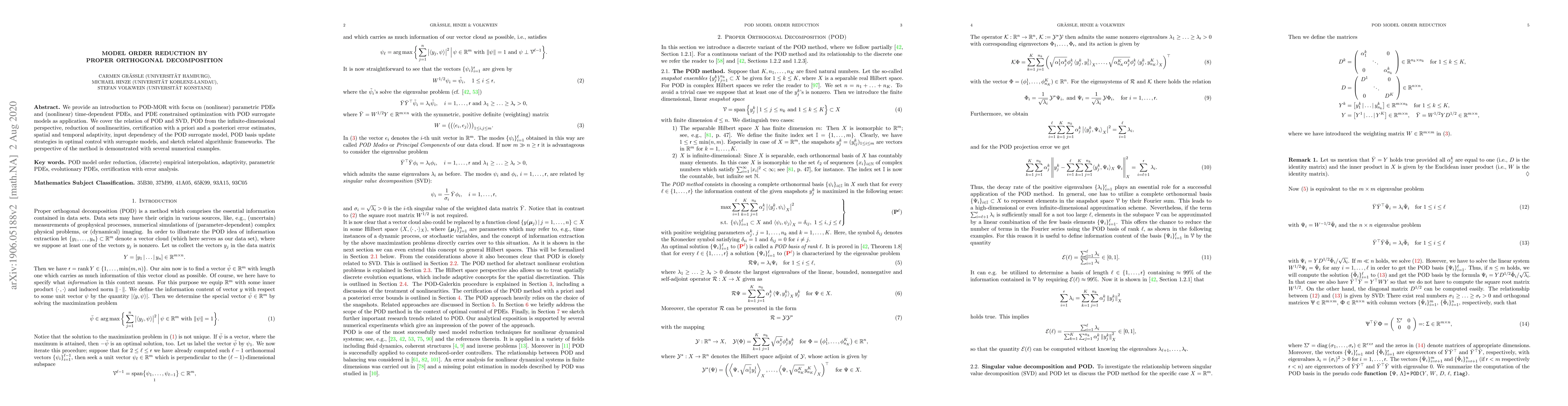 We provide an introduction to POD-MOR with focus on (nonlinear) parametric PDEs and (nonlinear) time-dependent PDEs, and PDE constrained optimization with POD surrogate models as application. We cover the relation of POD and SVD, POD from the infinite-dimensional perspective, reduction of nonlinearities, certification with a priori and a posteriori error estimates, spatial and temporal adaptivity, input dependency of the POD surrogate model, POD basis update strategies in optimal control with surrogate models, and sketch related algorithmic frameworks. The perspective of the method is demonstrated with several numerical examples.