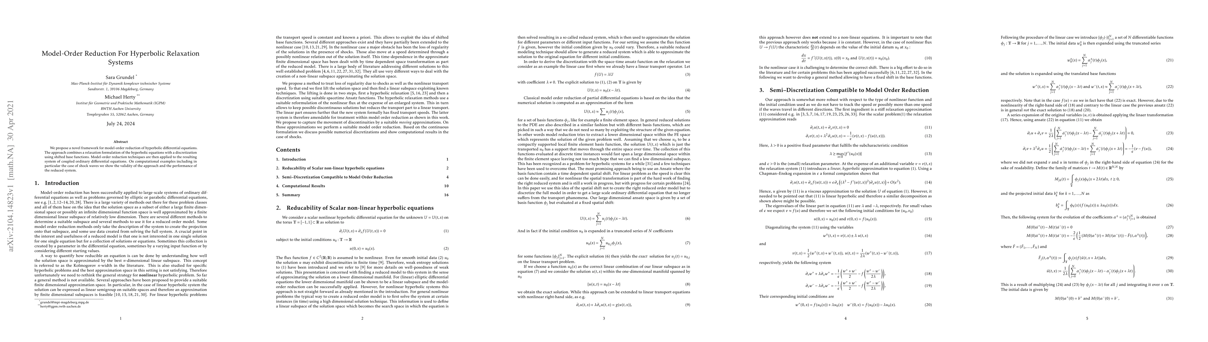 We propose a novel framework for model-order reduction of hyperbolic differential equations. The approach combines a relaxation formulation of the hyperbolic equations with a discretization using shifted base functions. Model-order reduction techniques are then applied to the resulting system of coupled ordinary differential equations. On computational examples including in particular the case of shock waves we show the validity of the approach and the performance of the reduced system.