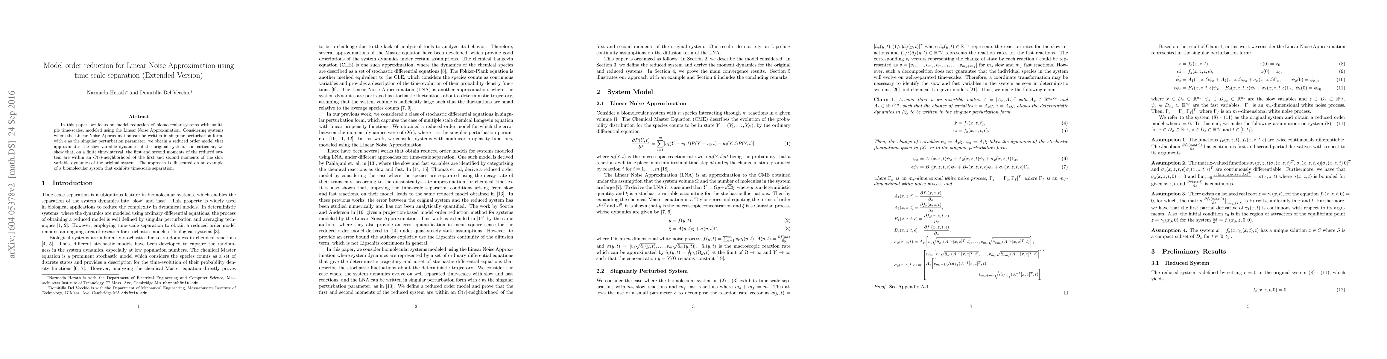 Researchers developed a method to reduce complexity of biomolecular systems with multiple time-scales using Linear Noise Approximation. Their approach shows that the reduced model accurately approximates the slow variable dynamics.