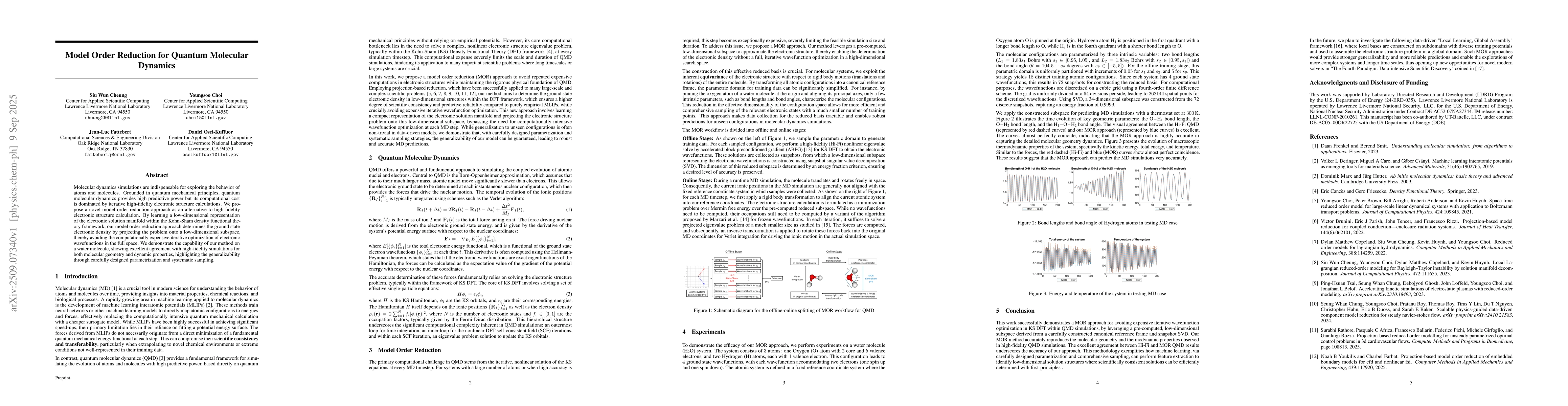 Molecular dynamics simulations are indispensable for exploring the behavior of atoms and molecules. Grounded in quantum mechanical principles, quantum molecular dynamics provides high predictive power but its computational cost is dominated by iterative high-fidelity electronic structure calculations. We propose a novel model order reduction approach as an alternative to high-fidelity electronic structure calculation. By learning a low-dimensional representation of the electronic solution manifold within the Kohn-Sham density functional theory framework, our model order reduction approach determines the ground state electronic density by projecting the problem onto a low-dimensional subspace, thereby avoiding the computationally expensive iterative optimization of electronic wavefunctions in the full space. We demonstrate the capability of our method on a water molecule, showing excellent agreement with high-fidelity simulations for both molecular geometry and dynamic properties, highlighting the generalizability through carefully designed parametrization and systematic sampling.