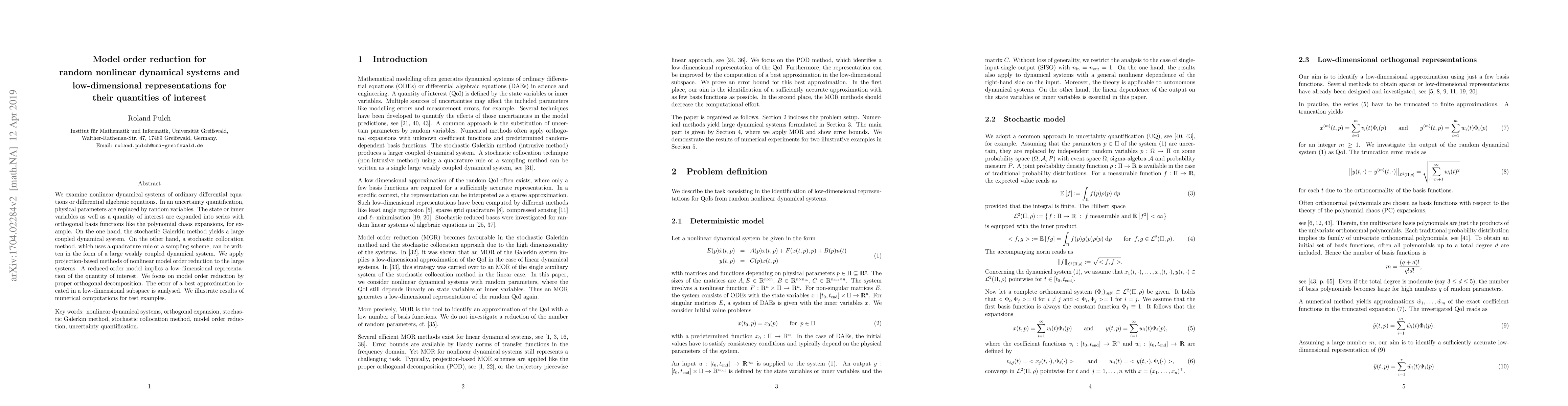 This paper investigates model order reduction techniques for random nonlinear dynamical systems, focusing on creating low-dimensional representations of quantities of interest. It employs projection-based methods, particularly proper orthogonal decomposition, to reduce the complexity of stochastic Galerkin and collocation methods, and analyzes the error of approximations in a low-dimensional subspace.