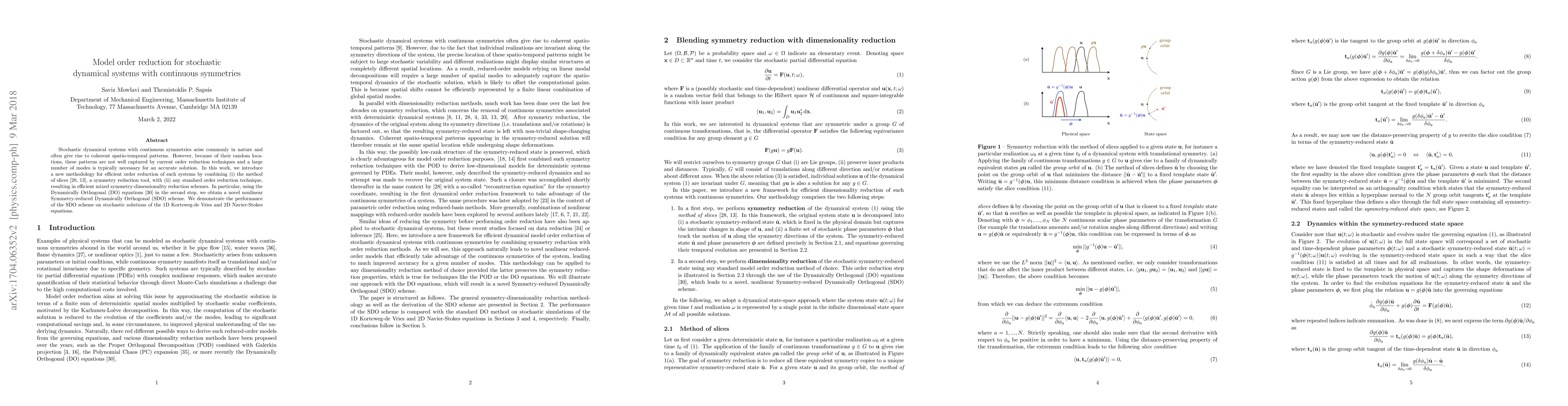 Stochastic dynamical systems with continuous symmetries arise commonly in nature and often give rise to coherent spatio-temporal patterns. However, because of their random locations, these patterns are not well captured by current order reduction techniques and a large number of modes is typically necessary for an accurate solution. In this work, we introduce a new methodology for efficient order reduction of such systems by combining (i) the method of slices, a symmetry reduction tool, with (ii) any standard order reduction technique, resulting in efficient mixed symmetry-dimensionality reduction schemes. In particular, using the Dynamically Orthogonal (DO) equations in the second step, we obtain a novel nonlinear Symmetry-reduced Dynamically Orthogonal (SDO) scheme. We demonstrate the performance of the SDO scheme on stochastic solutions of the 1D Korteweg-de Vries and 2D Navier-Stokes equations.