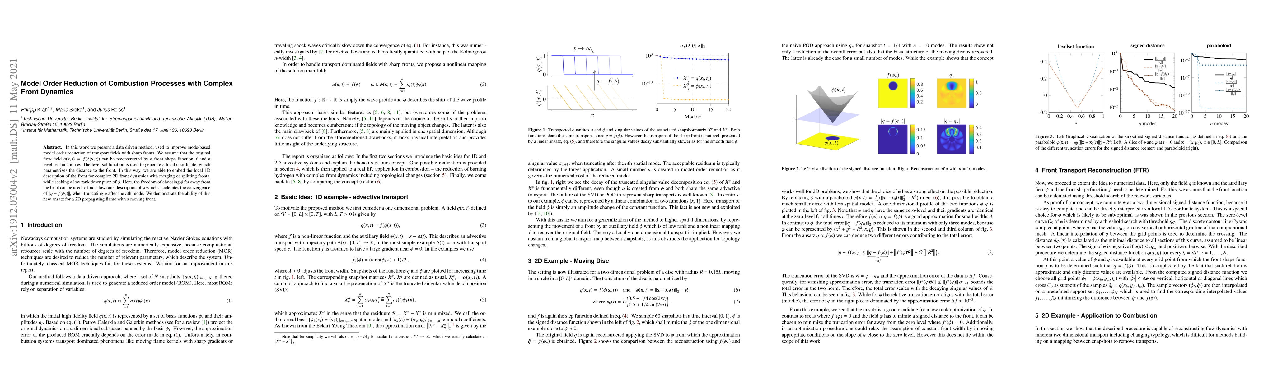 In this work we present a data driven method, used to improve mode-based model order reduction of transport fields with sharp fronts. We assume that the original flow field $q(\mathbf{x},t)=f(\phi(\mathbf{x},t))$ can be reconstructed by a front shape function $f$ and a level set function $\phi$. The level set function is used to generate a local coordinate, which parametrizes the distance to the front. In this way, we are able to embed the local 1D description of the front for complex 2D front dynamics with merging or splitting fronts, while seeking a low rank description of $\phi$. Here, the freedom of choosing $\phi$ far away from the front can be used to find a low rank description of $\phi$ which accelerates the convergence of $\Vert q- f(\phi_n)\Vert$, when truncating $\phi$ after the $n$th mode. We demonstrate the ability of this new ansatz for a 2D propagating flame with a moving front.