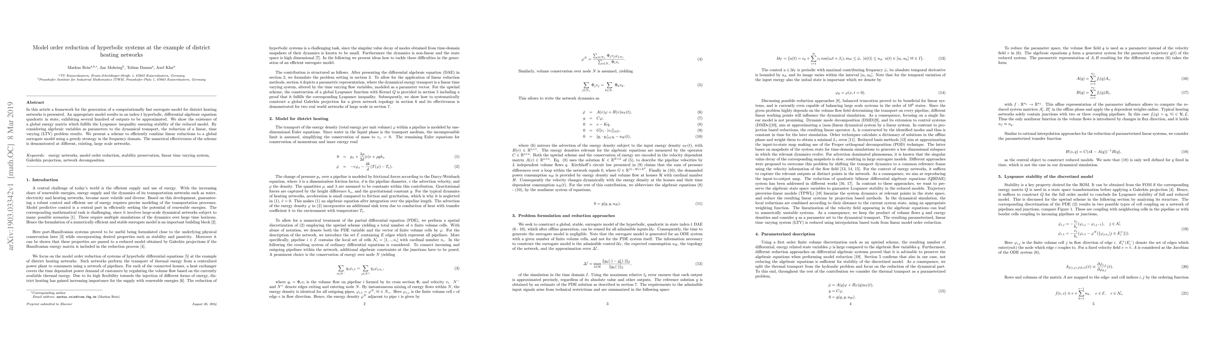 In this article a framework for the generation of a computationally fast surrogate model for district heating networks is presented. An appropriate model results in an index-1 hyperbolic, differential algebraic equation quadratic in state, exhibiting several hundred of outputs to be approximated. We show the existence of a global energy matrix which fulfills the Lyapunov inequality ensuring stability of the reduced model. By considering algebraic variables as parameters to the dynamical transport, the reduction of a linear, time varying (LTV) problem results. We present a scheme to efficiently combine linear reductions to a global surrogate model using a greedy strategy in the frequency domain. The numerical effectiveness of the scheme is demonstrated at different, existing, large scale networks.